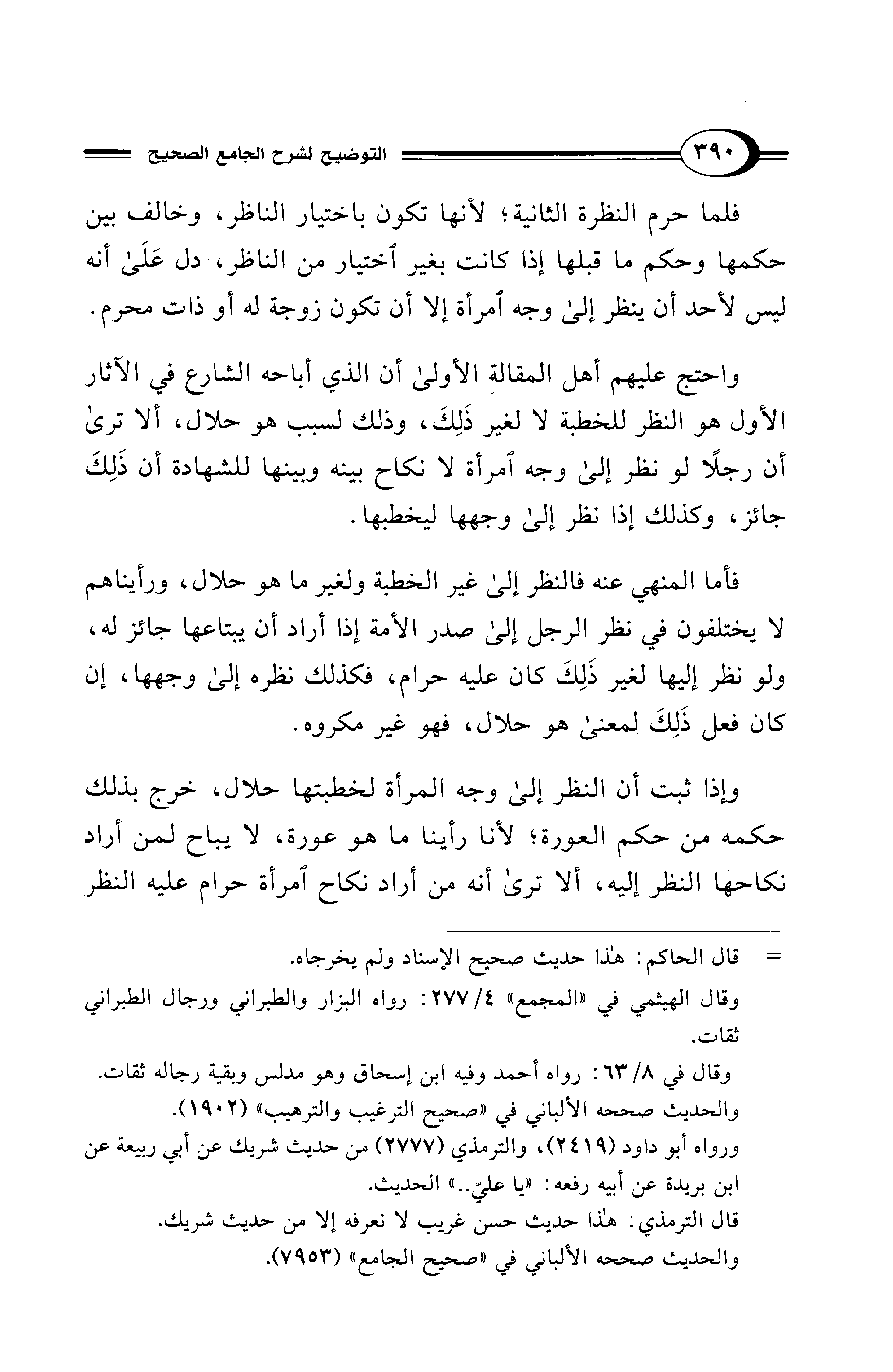 واحتج عليهم أهل المقالة الأولى أن الذي أباحه الشارع في الآثار الأول هو النظر للخطبة لا لغير ذَلِكَ، وذلك لسبب هو حلال، ألا ترى أن رجلًا لو نظر إلى وجه امرأة لا نكاح بينه وبينها للشهادة أن ذَلِكَ جائز، وكذلك إذا نظر إلى وجهها ليخطبها.