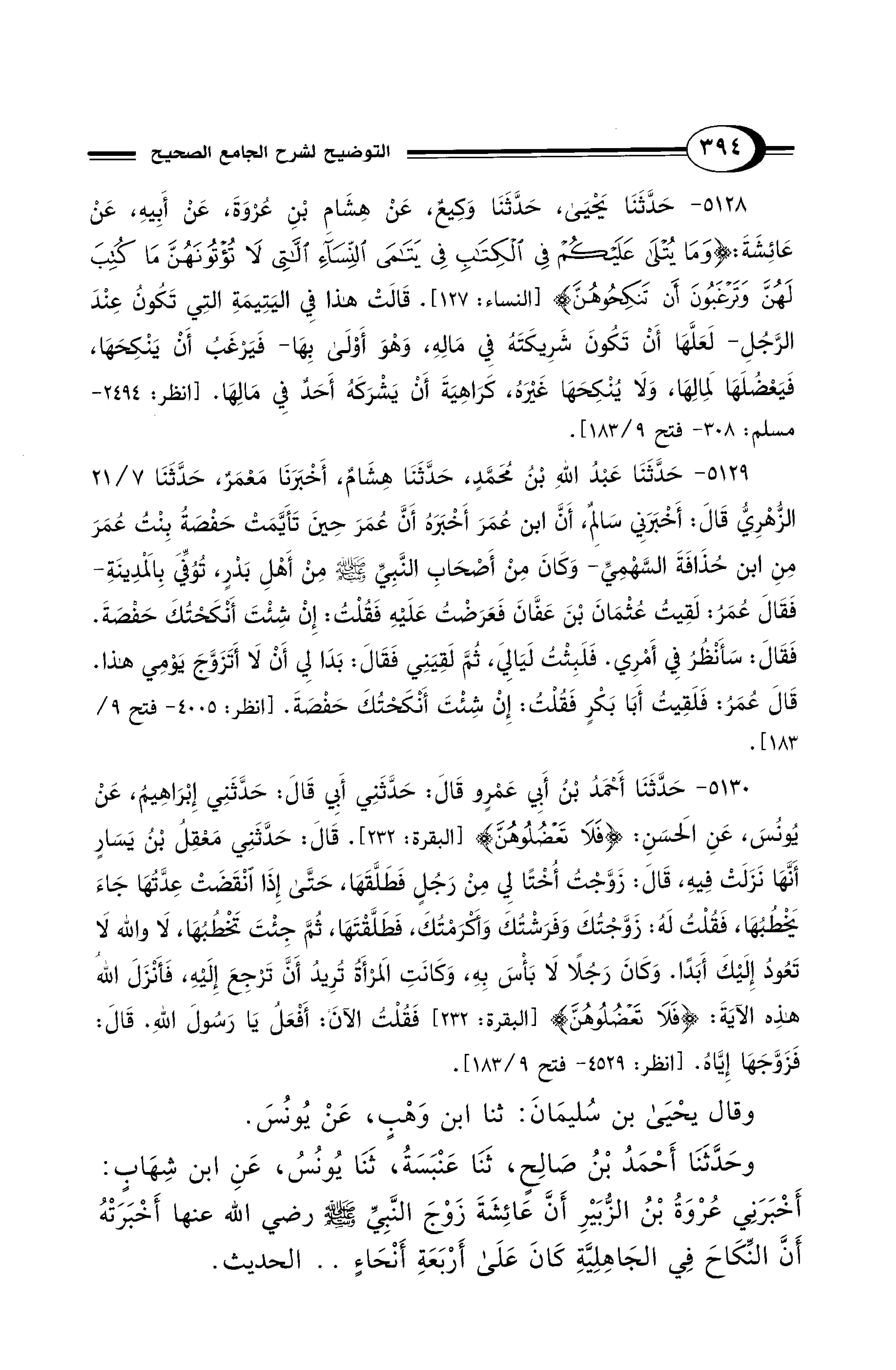 5128 - حَدَّثَنَا يَحْيَى, حَدَّثَنَا وَكِيعٌ, عَنْ هِشَامِ بْنِ عُرْوَةَ, عَنْ أَبِيهِ, عَنْ عَائِشَةَ: {وَمَا يُتْلَى عَلَيْكُمْ فِي الْكِتَابِ فِي يَتَامَى النِّسَاءِ اللاَّتِى لاَ تُؤْتُونَهُنَّ مَا كُتِبَ لَهُنَّ وَتَرْغَبُونَ أَنْ تَنْكِحُوهُنَّ} [النساء:127]. قَالَتْ هَذَا فِي الْيَتِيمَةِ الَّتِي تَكُونُ عِنْدَ الرَّجُلِ -لَعَلَّهَا أَنْ تَكُونَ شَرِيكَتَهُ فِي مَالِهِ، وَهْوَ أَوْلَى بِهَا- فَيَرْغَبُ أَنْ يَنْكِحَهَا، فَيَعْضُلَهَا لِمَالِهَا، وَلاَ يُنْكِحَهَا غَيْرَهُ، كَرَاهِيَةَ أَنْ يَشْرَكَهُ أَحَدٌ فِي مَالِهَا. [انظر: 2494 - مسلم: 308 - فتح 9/ 183].