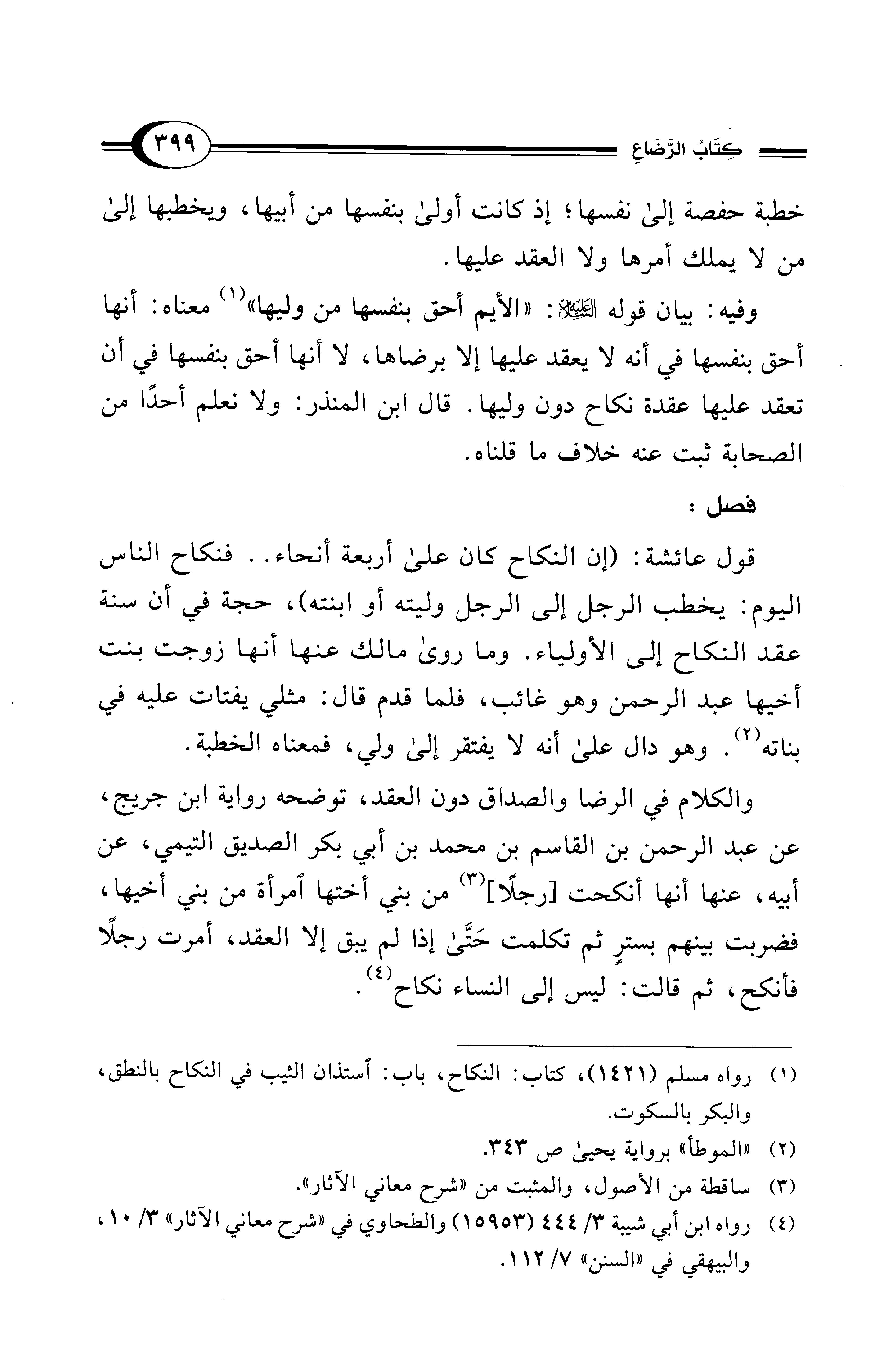 قول عائشة: (إن النكاح كان عَلَى أربعة أنحاء .. فنكاح الناس اليوم: يخطب الرجل إلى الرجل وليته أو ابنته)، حجة في أن سنة عقد النكاح إلى الأولياء. وما روى مالك عنها أنها زوجت بنت أخيها عبد الرحمن وهو غائب، فلما قدم قال: مثلي يفتات عليه في بناته (¬2). وهو دال على أنه لا يفتقر إلى ولي، فمعناه الخطبة.