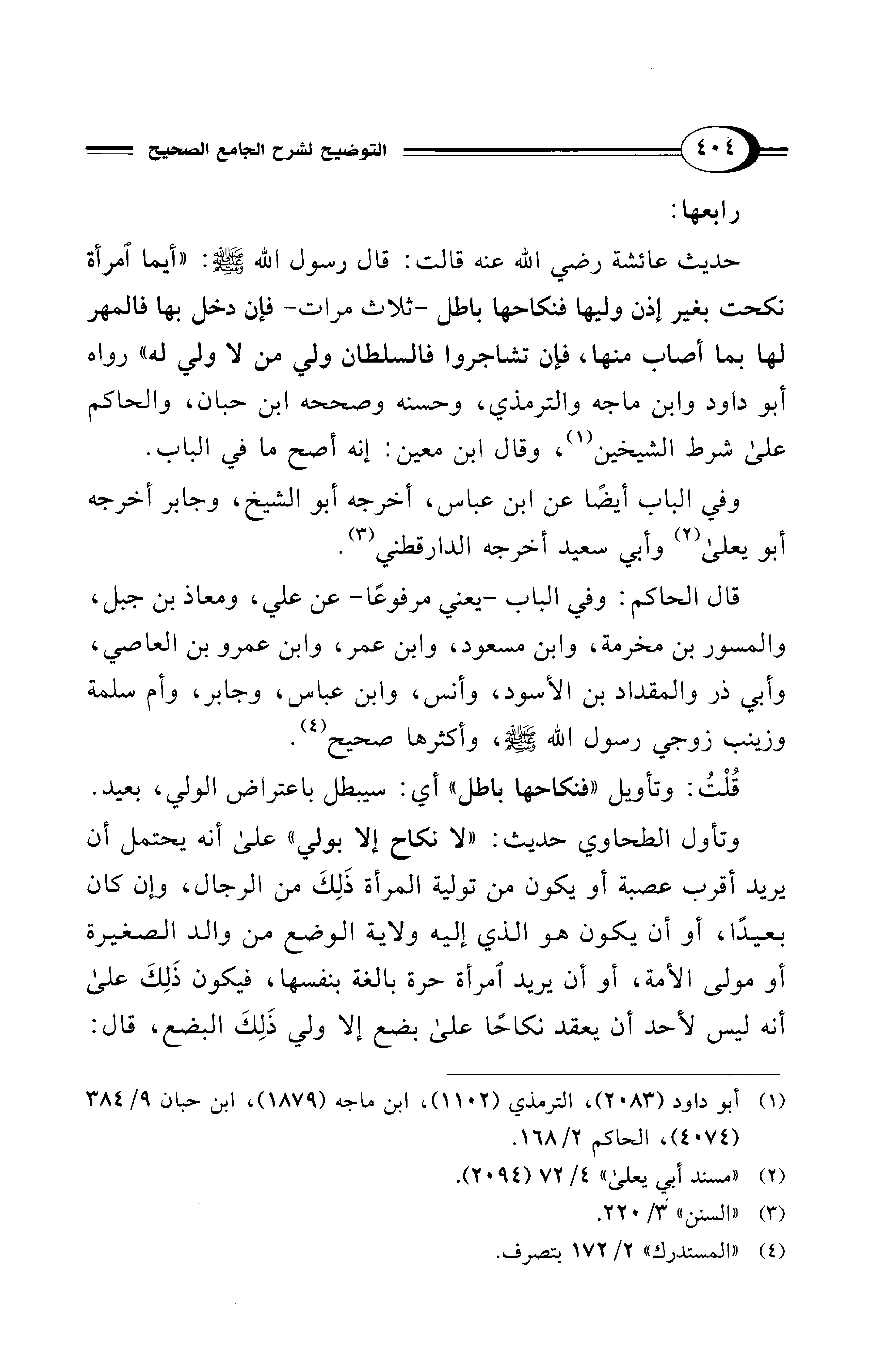 حديث عائشة - رضي الله عنه - قالت: قال رسول الله - صلى الله عليه وسلم -: "أيما امرأة نكحت بغير إذن وليها فنكاحها باطل -ثلاث مرات- فإن دخل بها فالمهر لها بما أصاب منها، فإن تشاجروا فالسلطان ولي من لا ولي له" رواه أبو داود وابن ماجه والترمذي، وحسنه وصححه ابن حبان، والحاكم على شرط الشيخين (¬1)، وقال ابن معين: إنه أصح ما في الباب.