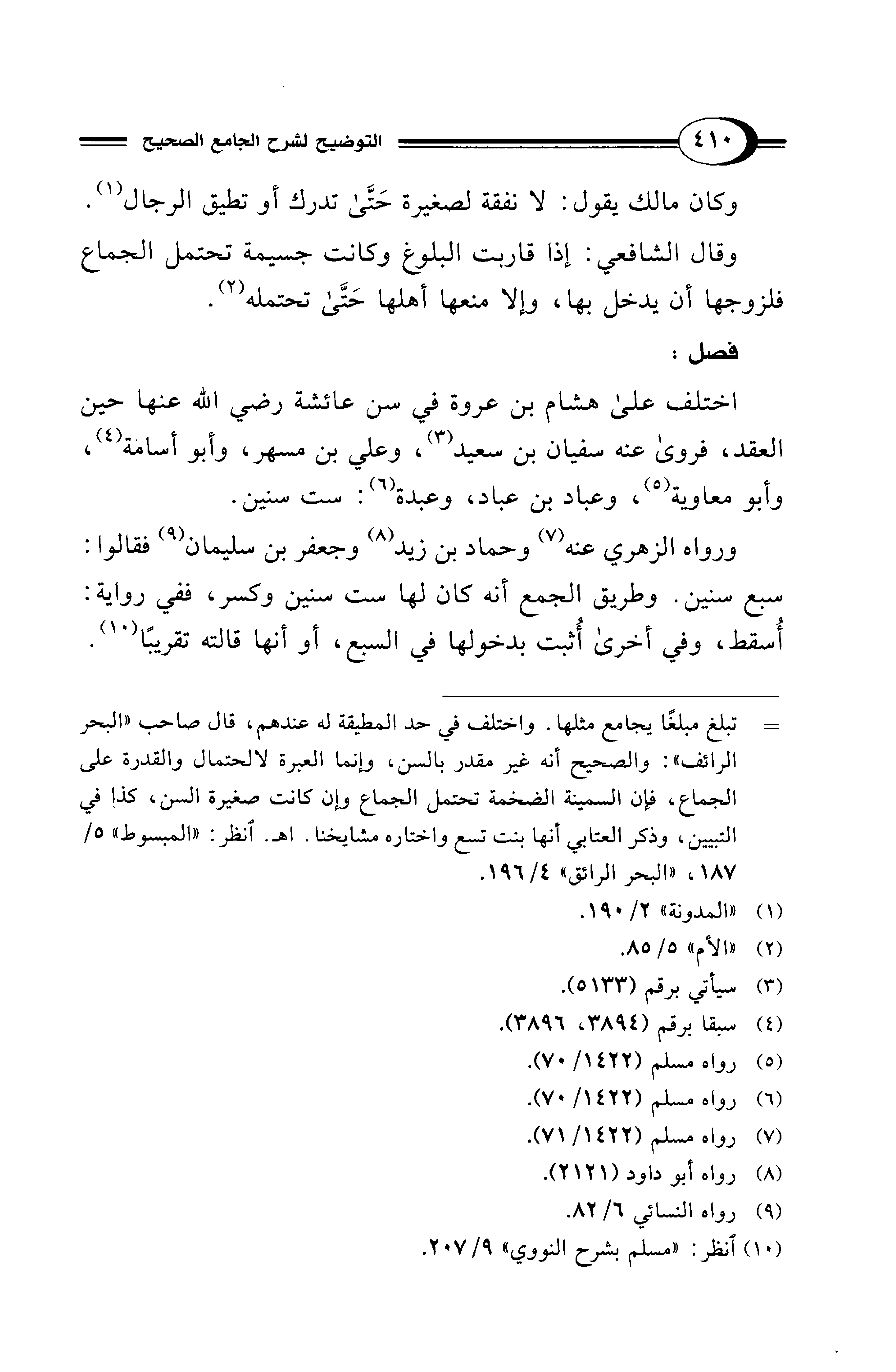 اختلف على هشام بن عروة في سن عائشة - رضي الله عنها - حين العقد، فروى عنه سفيان بن سعيد (¬3)، وعلي بن مسهر، وأبو أسامة (¬4)، وأبو معاوية (¬5)، وعباد بن عباد، وعبدة (¬6): ست سنين.