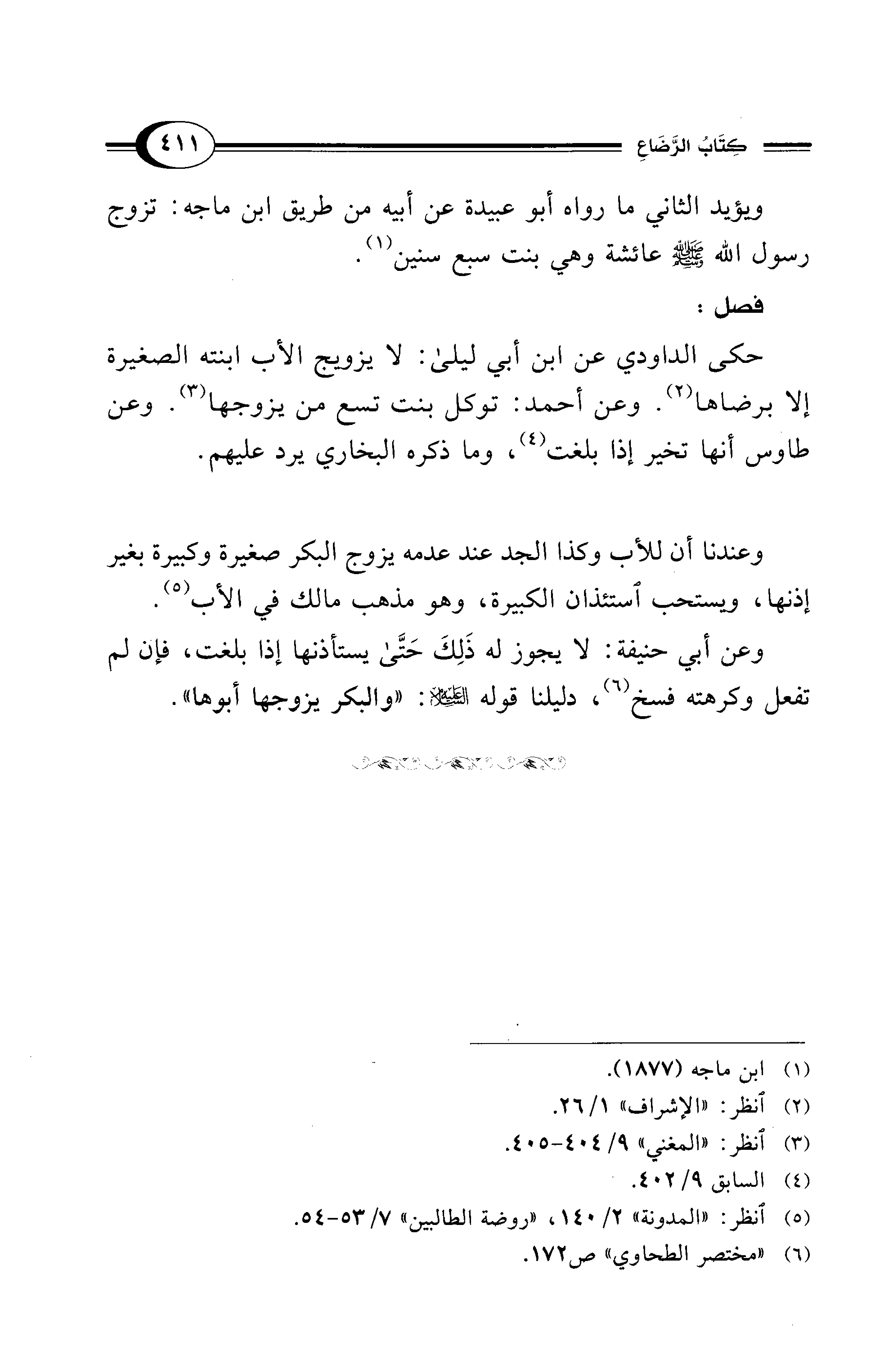 ويؤيد الثاني ما رواه أبو عبيدة عن أبيه من طريق ابن ماجه: تزوج رسول الله - صلى الله عليه وسلم - عائشة وهي بنت سبع سنين (¬1).