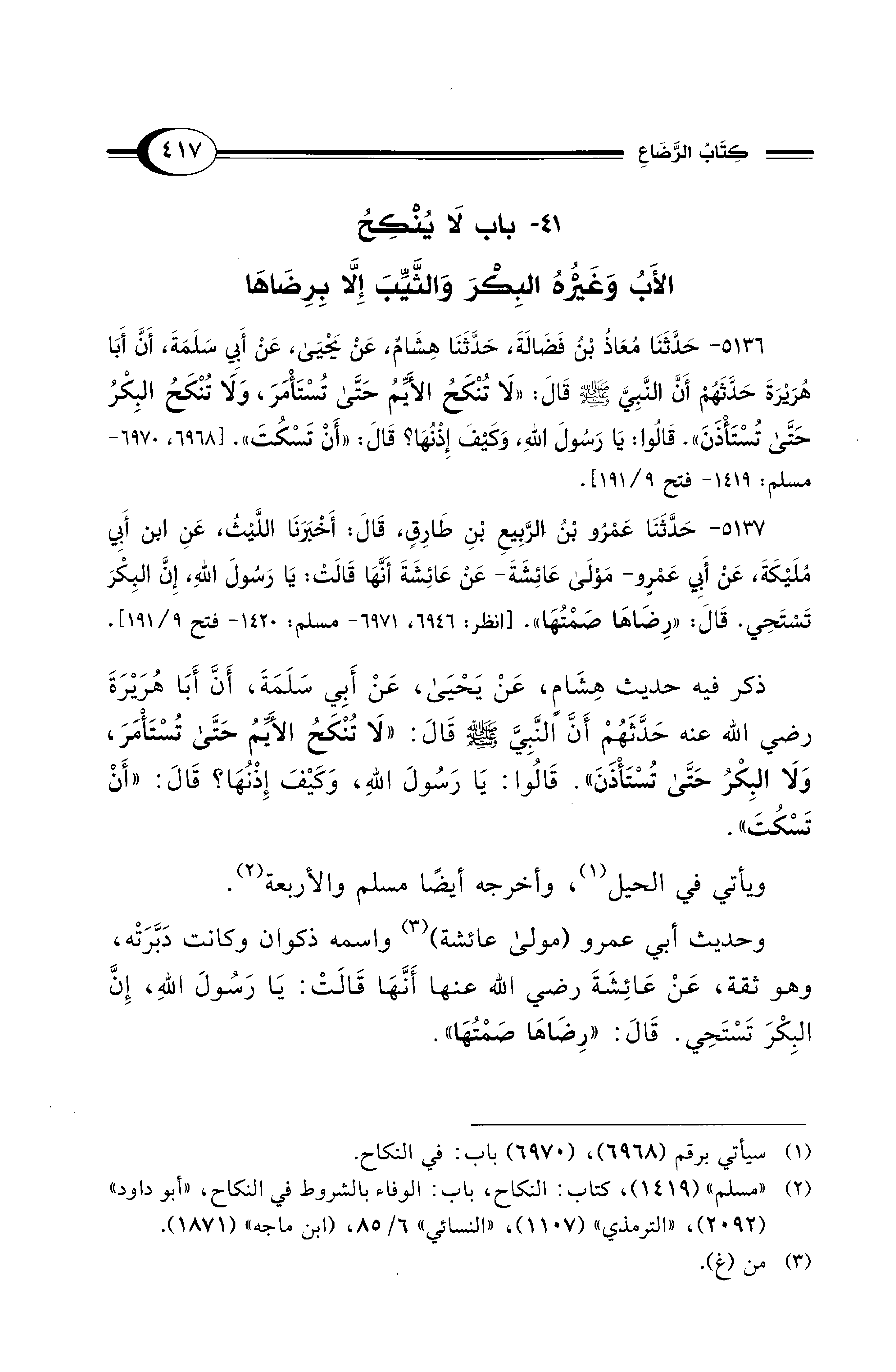 5136 - حَدَّثَنَا مُعَاذُ بْنُ فَضَالَةَ, حَدَّثَنَا هِشَامٌ, عَنْ يَحْيَى, عَنْ أَبِي سَلَمَةَ, أَنَّ أَبَا هُرَيْرَةَ حَدَّثَهُمْ أَنَّ النَّبِيَّ - صلى الله عليه وسلم - قَالَ: «لاَ تُنْكَحُ الأَيِّمُ حَتَّى تُسْتَأْمَرَ, وَلاَ تُنْكَحُ الْبِكْرُ حَتَّى تُسْتَأْذَنَ». قَالُوا: يَا رَسُولَ اللهِ, وَكَيْفَ إِذْنُهَا؟ قَالَ: «أَنْ تَسْكُتَ». [6968، 6970 - مسلم: 1419 - فتح 9/ 191].