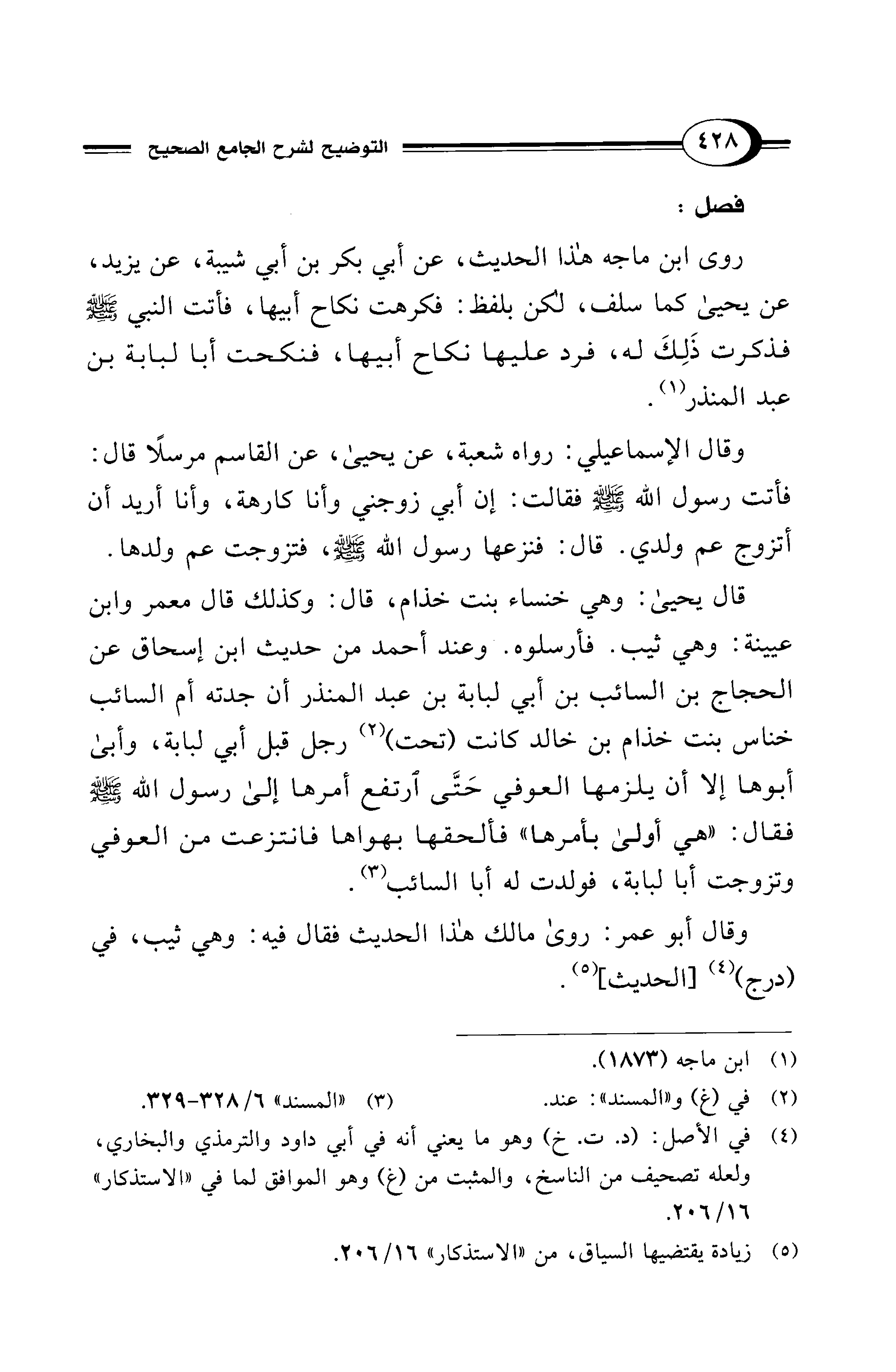 روى ابن ماجه هذا الحديث، عن أبي بكر بن أبي شيبة، عن يزيد، عن يحيى كما سلف، لكن بلفظ: فكرهت نكاح أبيها، فأتت النبي - صلى الله عليه وسلم - فذكرت ذَلِكَ له، فرد عليها نكاح أبيها، فنكحت أبا لبابة بن عبد المنذر (¬1).