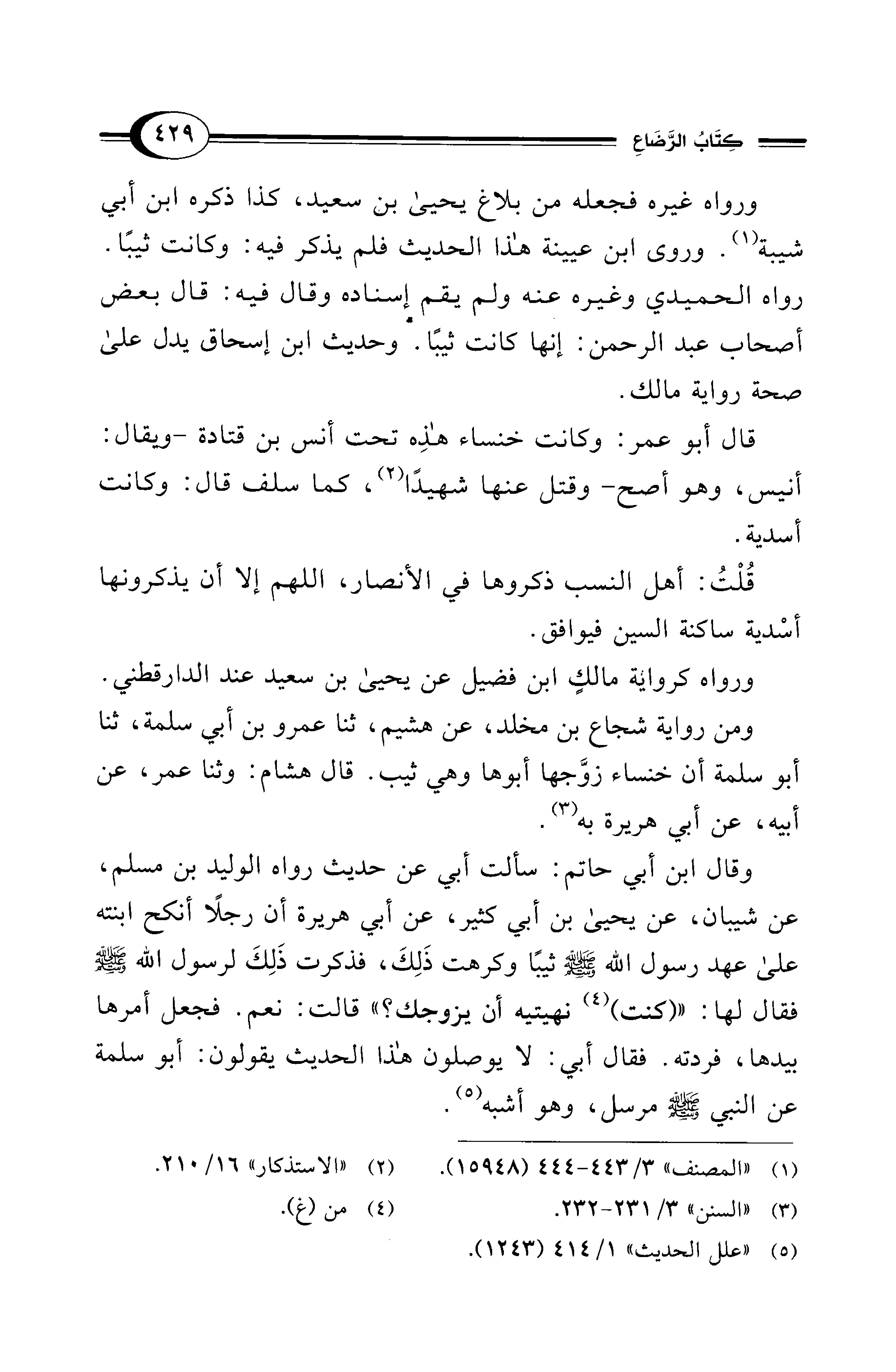 ومن رواية شجاع بن مخلد، عن هشيم، ثنا عمرو بن أبي سلمة، ثنا أبو سلمة أن خنساء زوَّجها أبوها وهي ثيب. قال هشام: وثنا عمر، عن أبيه، عن أبي هريرة به (¬3).