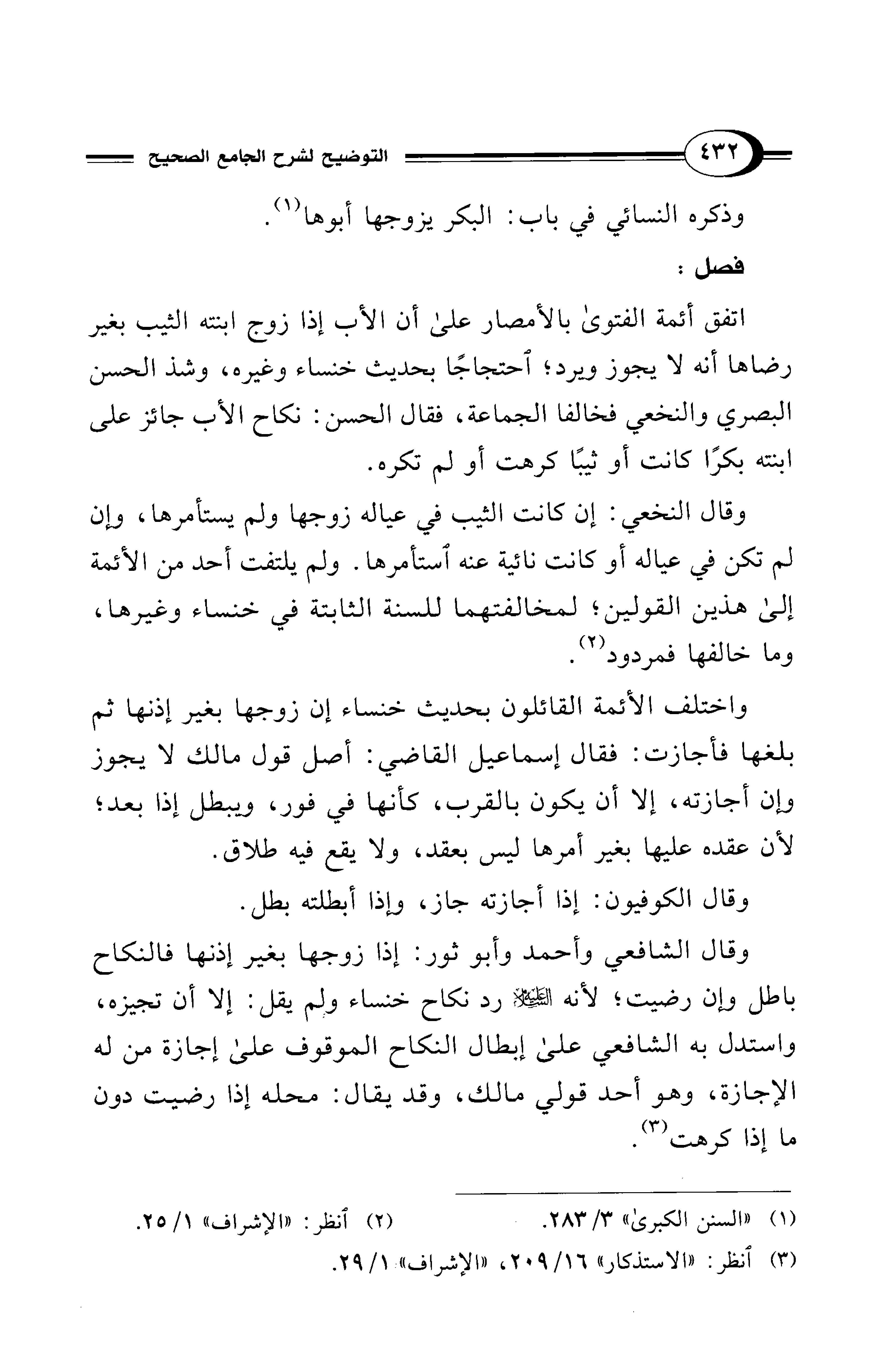 وقال النخعي: إن كانت الثيب في عياله زوجها ولم يستأمرها، وإن لم تكن في عياله أو كانت نائية عنه أستأمرها. ولم يلتفت أحد من الأئمة إلى هذين القولين؛ لمخالفتهما للسنة الثابتة في خنساء وغيرها، وما خالفها فمردود (¬2).