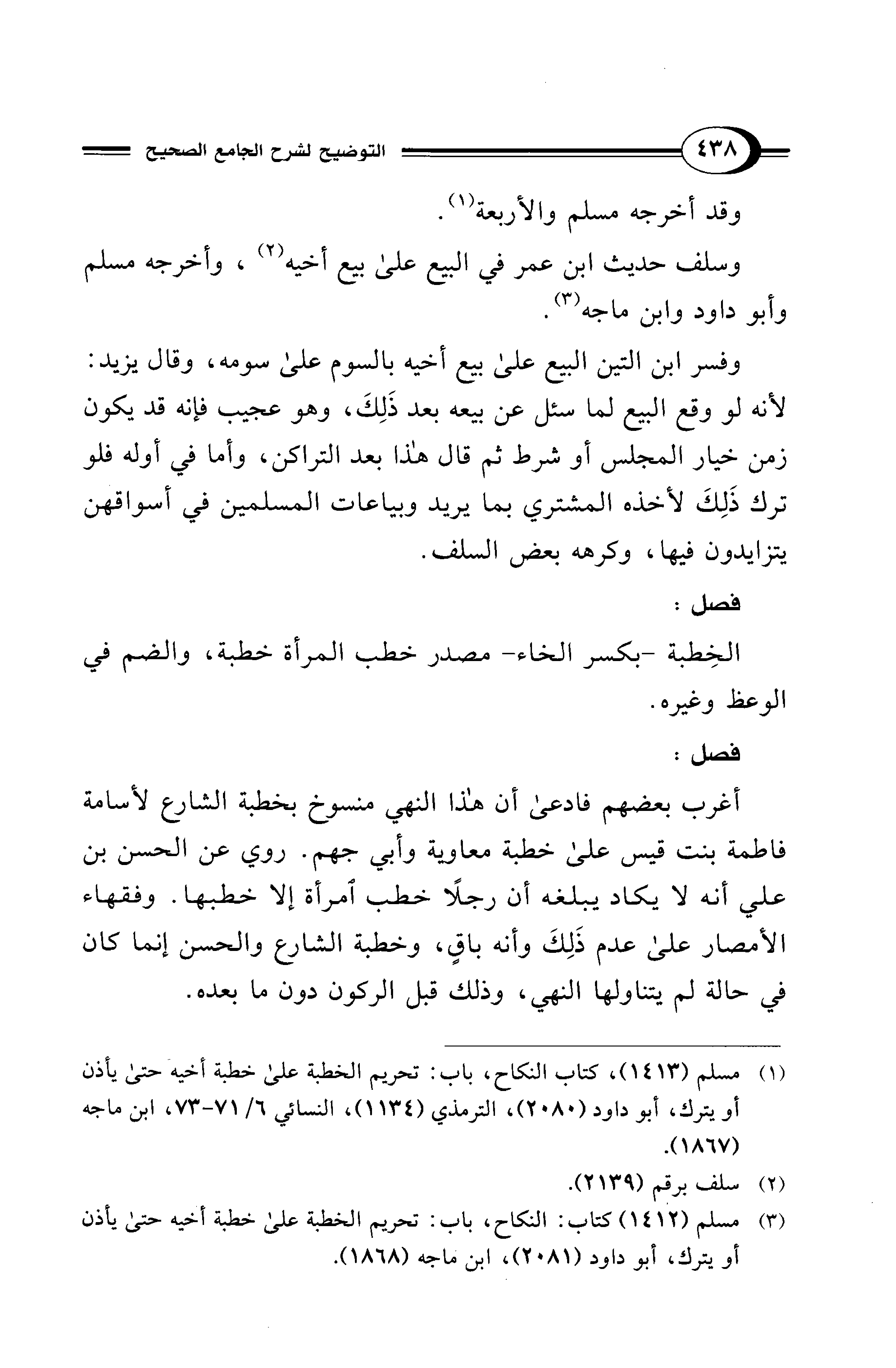 (¬1) مسلم (1413)، كتاب النكاح، باب: تحريم الخطبة على خطبة أخيه حتى يأذن أو يترك، أبو داود (2080)، الترمذي (1134)، النسائي 6/ 71 - 73، ابن ماجه (1867).