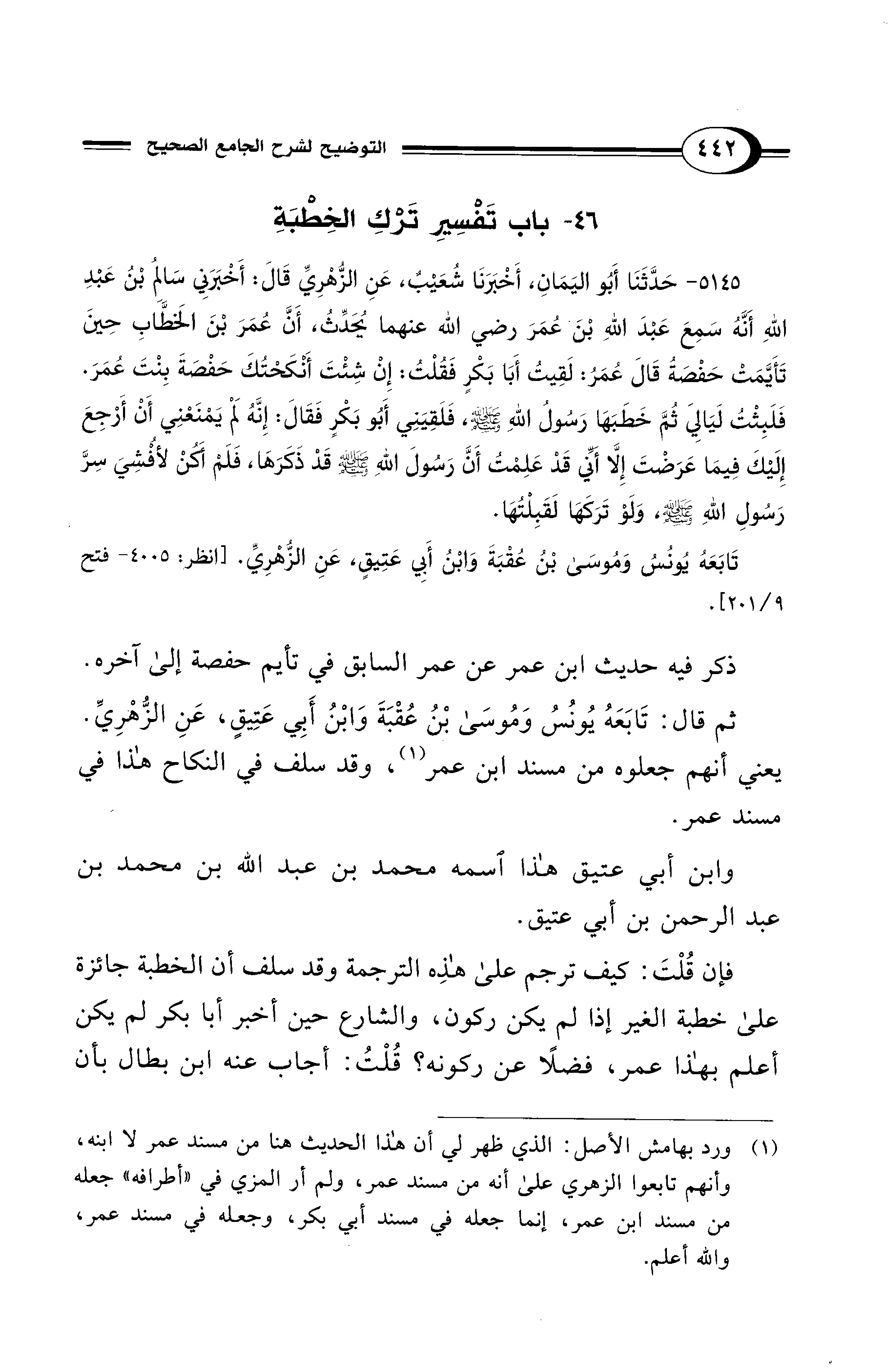 (¬1) ورد بهامش الأصل: الذي ظهر لي أن هذا الحديث هنا من مسند عمر لا ابنه، وأنهم تابعوا الزهري على أنه من مسند عمر، ولم أر المزي في "أطرافه" جعله من مسند ابن عمر، إنما جعله في مسند أبي بكر، وجعله في مسند عمر، والله أعلم.