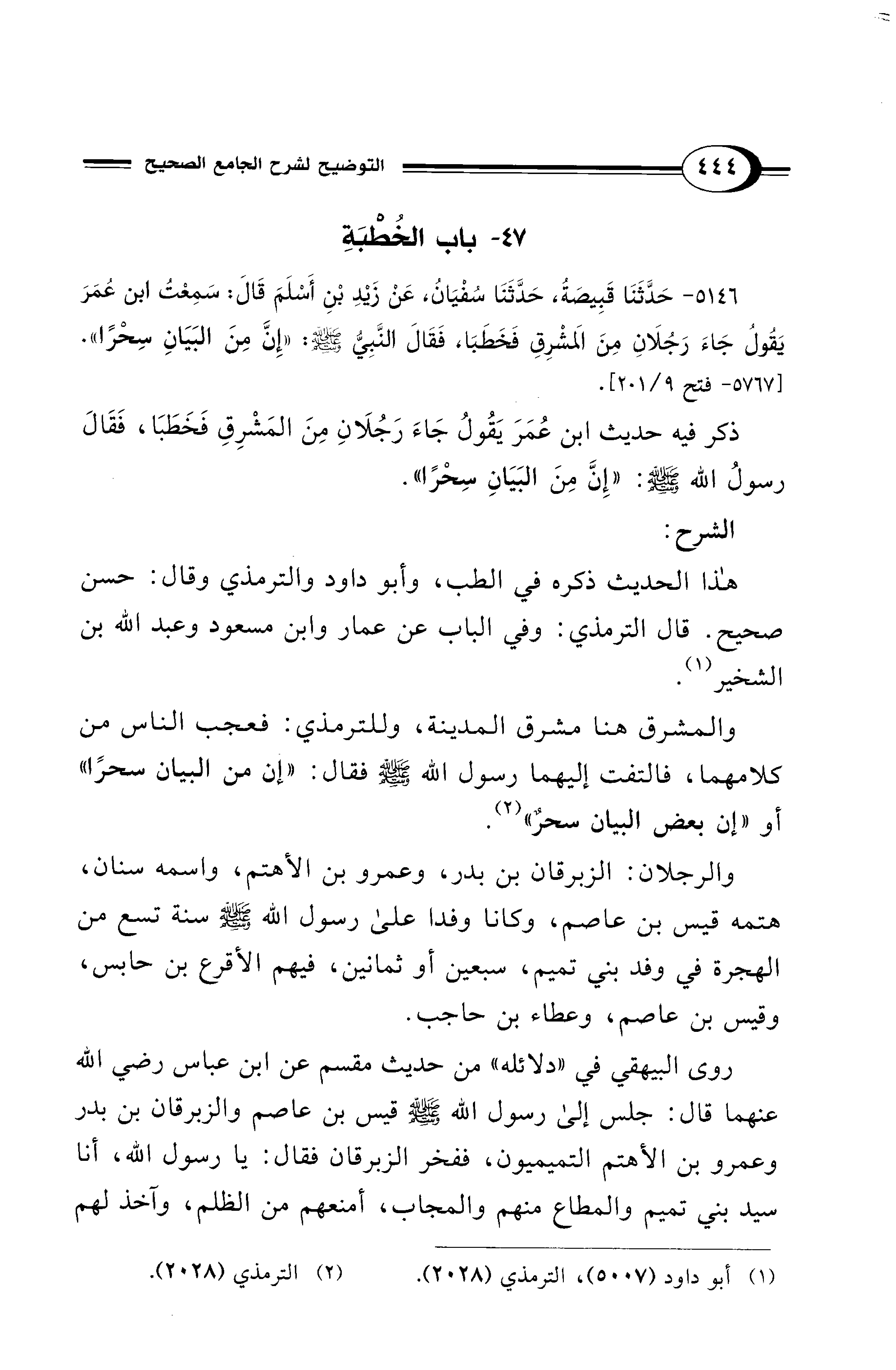 5146 - حَدَّثَنَا قَبِيصَةُ, حَدَّثَنَا سُفْيَانُ, عَنْ زَيْدِ بْنِ أَسْلَمَ قَالَ: سَمِعْتُ ابْنَ عُمَرَ يَقُولُ جَاءَ رَجُلاَنِ مِنَ الْمَشْرِقِ فَخَطَبَا, فَقَالَ النَّبِيُّ - صلى الله عليه وسلم -: «إِنَّ مِنَ الْبَيَانِ سِحْرًا». [5767 - فتح 9/ 201].
