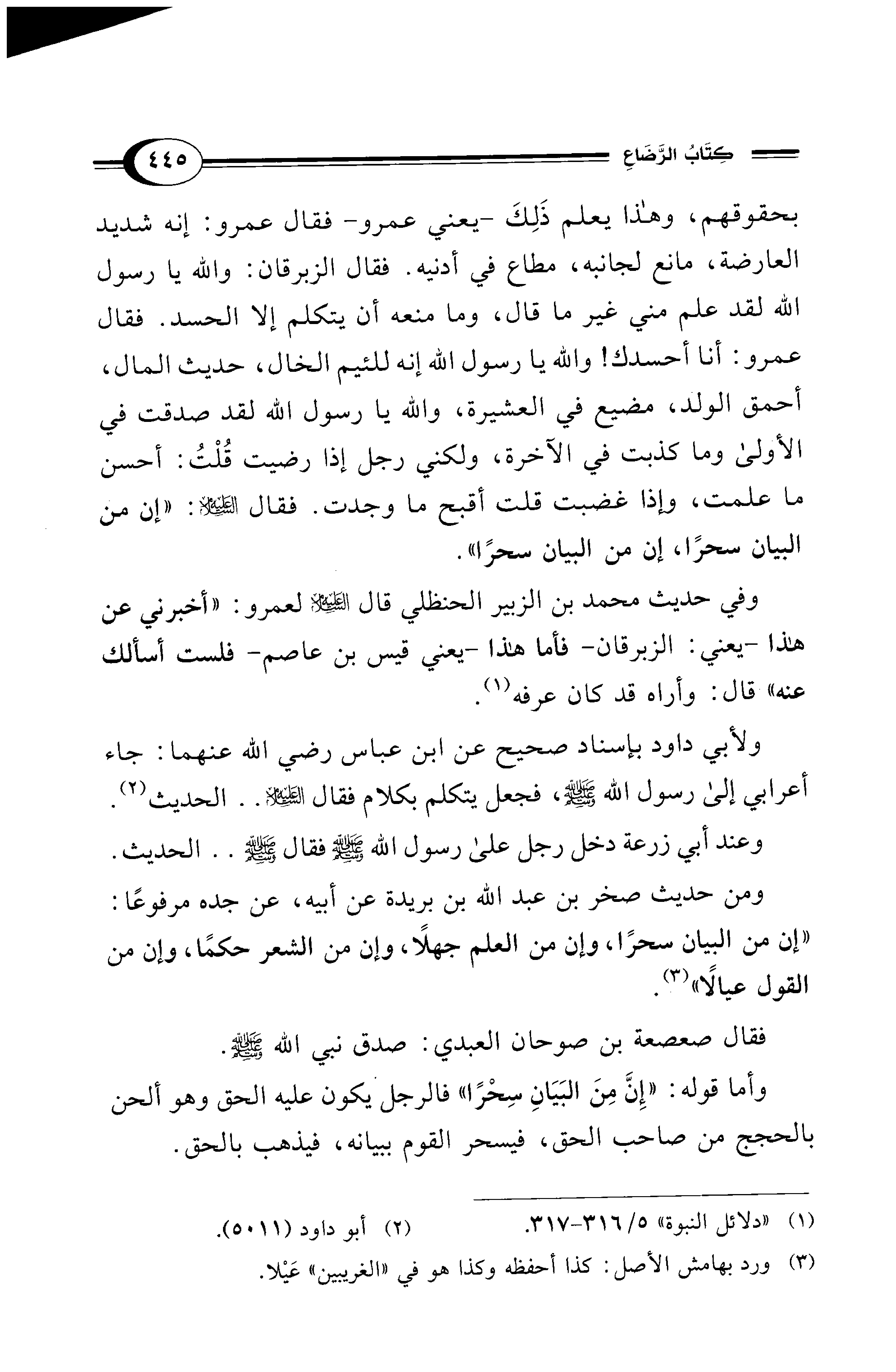 بحقوقهم، وهذا يعلم ذَلِكَ -يعني عمرو- فقال عمرو: إنه شديد العارضة، مانع لجانبه، مطاع في أدنيه. فقال الزبرقان: والله يا رسول الله لقد علم مني غير ما قال، وما منعه أن يتكلم إلا الحسد. فقال عمرو: أنا أحسدك! والله يا رسول الله إنه للئيم الخال، حديث المال، أحمق الولد، مضيع في العشيرة، والله يا رسول الله لقد صدقت في الأولى وما كذبت في الآخرة، ولكني رجل إذا رضيت قُلْتُ: أحسن ما علمت، وإذا غضبت قلت أقبح ما وجدت. فقال - عليه السلام -: "إن من البيان سحرًا، إن من البيان سحرًا".