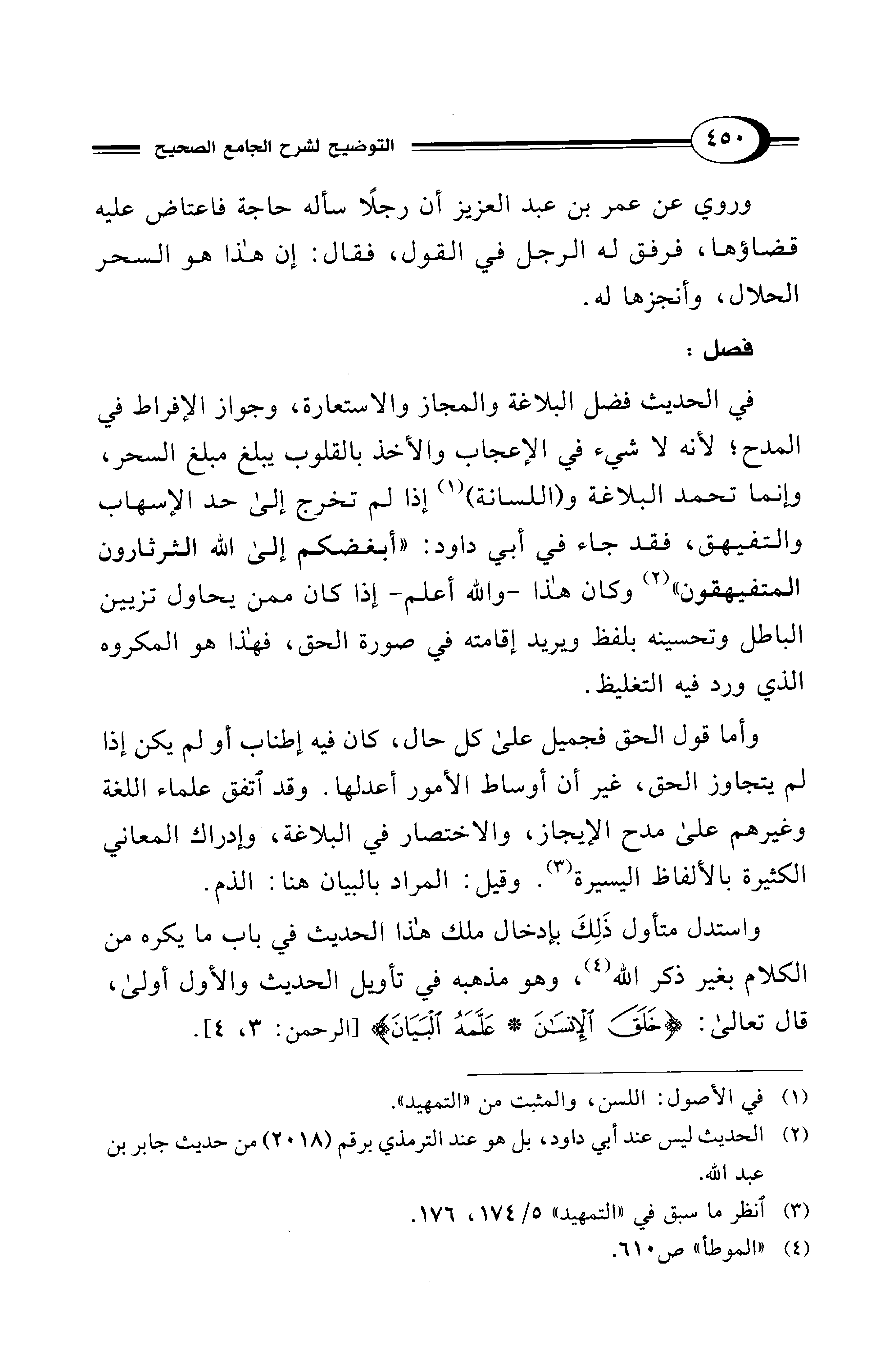 في الحديث فضل البلاغة والمجاز والاستعارة، وجواز الإفراط في المدح؛ لأنه لا شيء في الإعجاب والأخذ بالقلوب يبلغ مبلغ السحر، وإنما تحمد البلاغة و (اللسانة) (¬1) إذا لم تخرج إلى حد الإسهاب والتفيهق، فقد جاء في أبي داود: "أبغضكم إلى الله الثرثارون المتفيهقون" (¬2) وكان هذا -والله أعلم- إذا كان ممن يحاول تزيين الباطل وتحسينه بلفظ ويريد إقامته في صورة الحق، فهذا هو المكروه الذي ورد فيه التغليظ.