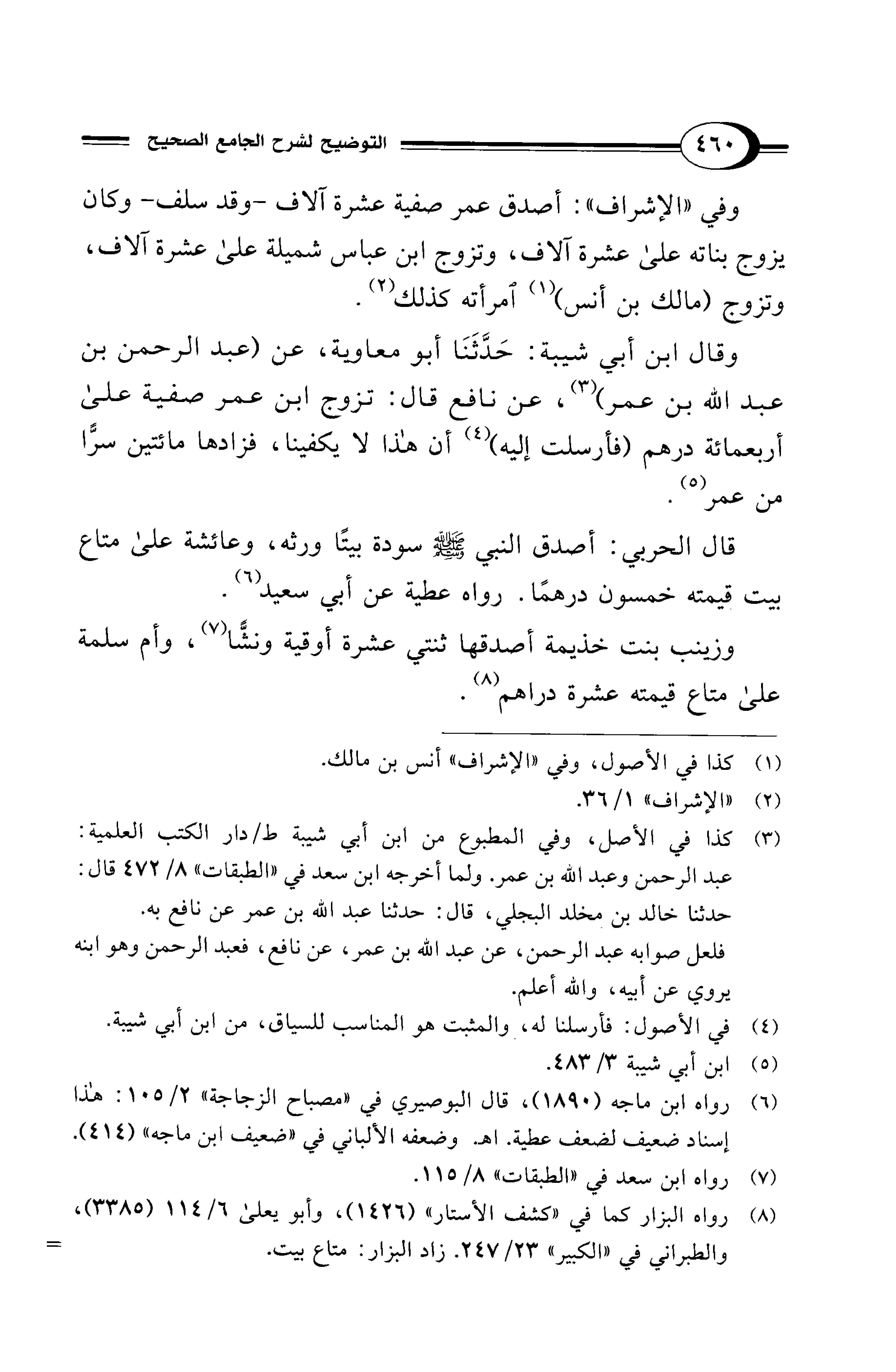 وقال ابن أبي شيبة: حَدَّثَنَا أبو معاوية، عن (عبد الرحمن بن عبد الله بن عمر) (¬3)، عن نافع قال: تزوج ابن عمر صفية على أربعمائة درهم (فأرسلت إليه) (¬4) أن هذا لا يكفينا، فزادها مائتين سرًّا من عمر (¬5).