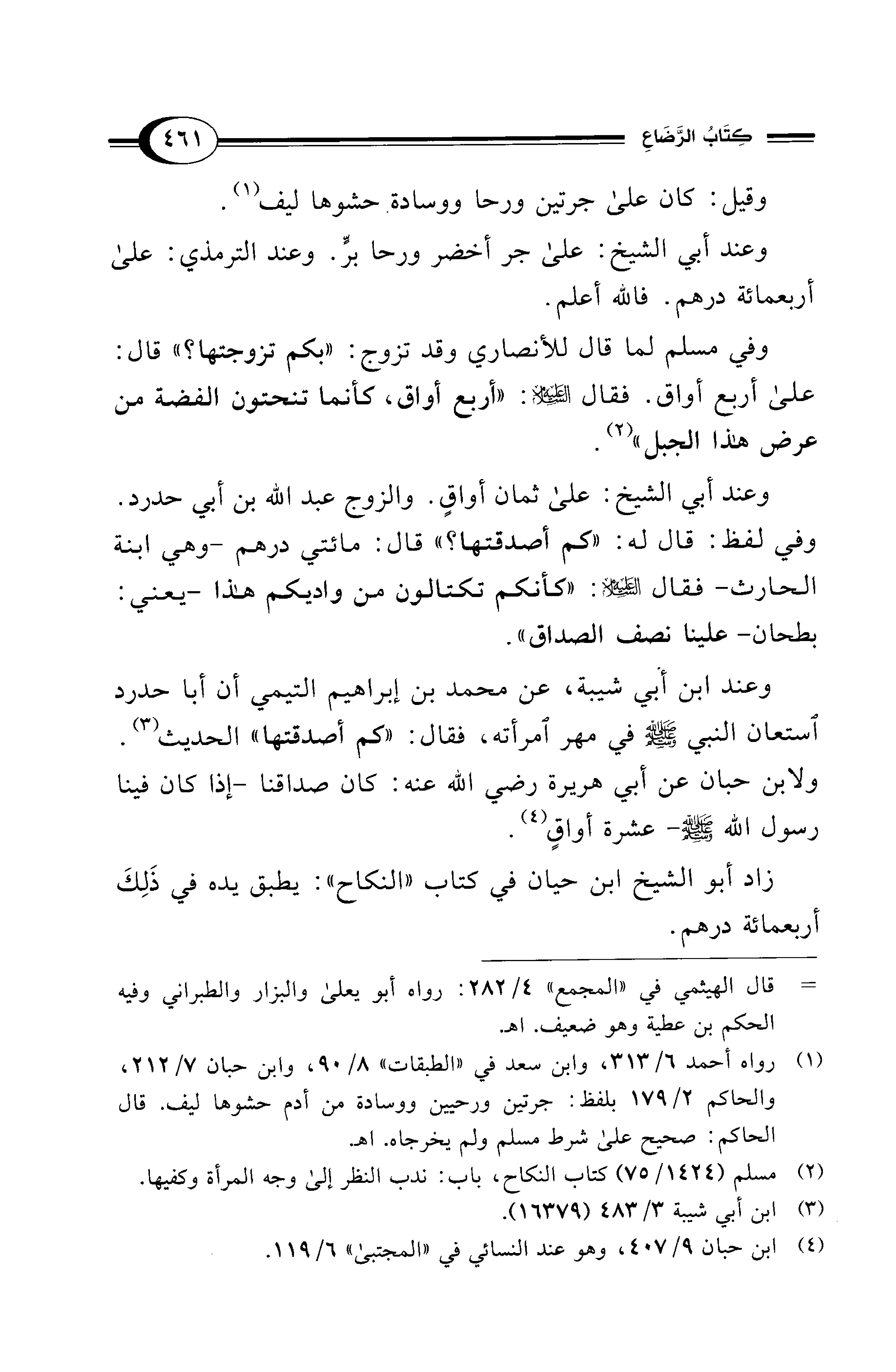 وفي لفظ: قال له: "كم أصدقتها؟ " قال: مائتي درهم -وهي ابنة الحارث- فقال - عليه السلام -: "كأنكم تكتالون من واديكم هذا -يعني: بطحان- علينا نصف الصداق".