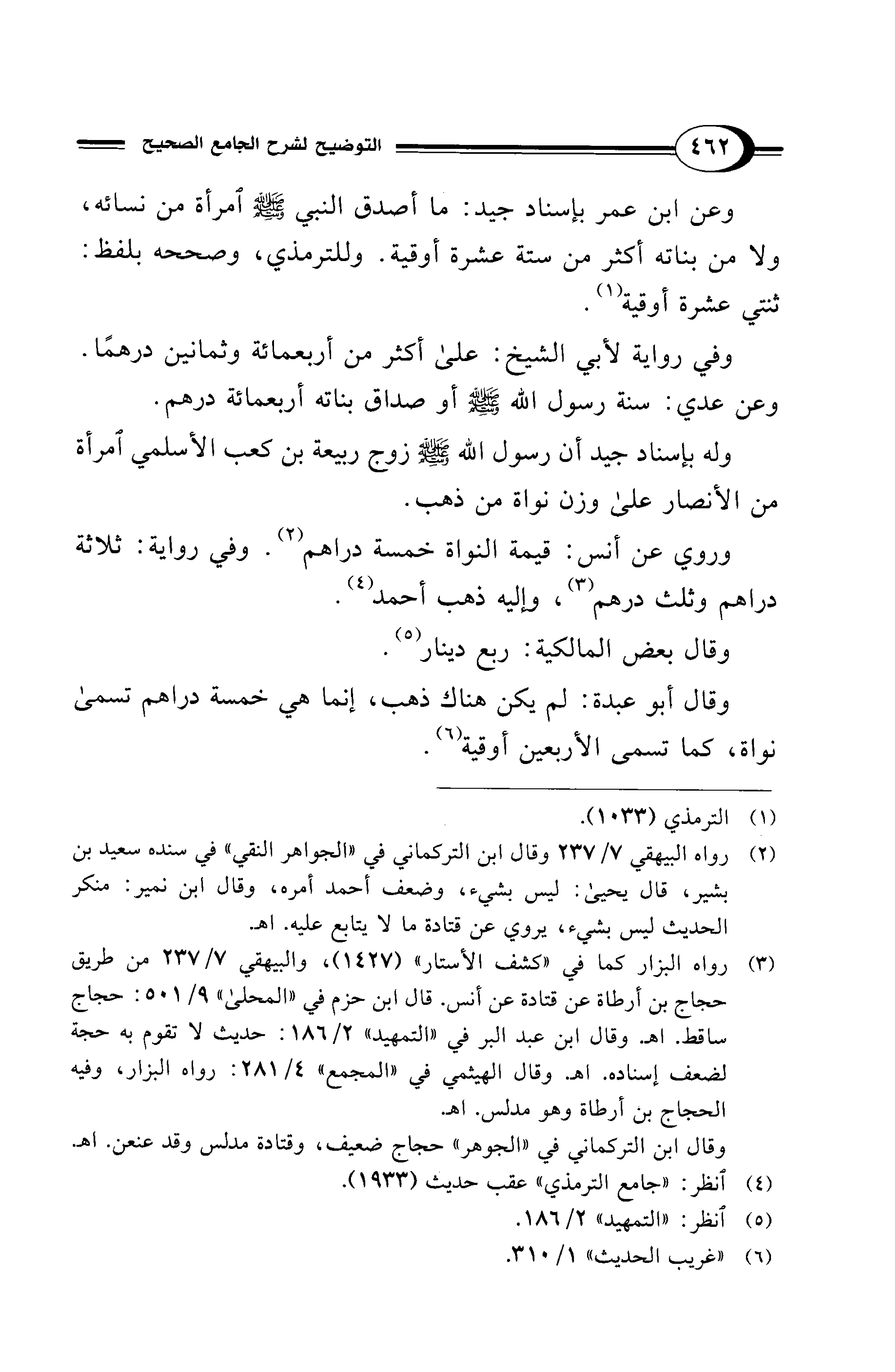 وعن ابن عمر بإسناد جيد: ما أصدق النبي - صلى الله عليه وسلم - امرأة من نسائه، ولا من بناته أكثر من ستة عشرة أوقية. وللترمذي، وصححه بلفظ: ثنتي عشرة أوقية (¬1).