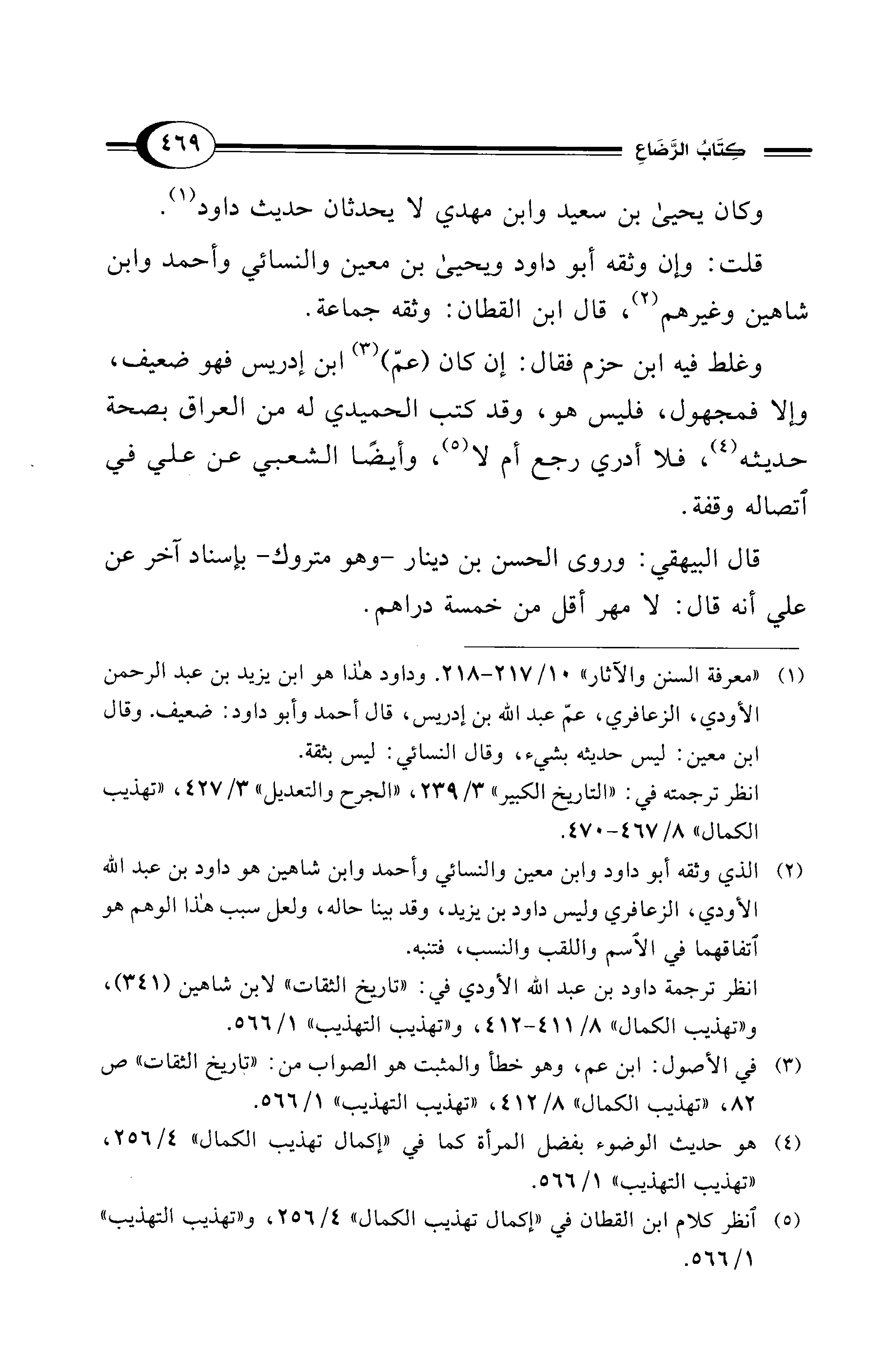 (¬1) "معرفة السنن والآثار" 10/ 217 - 218. وداود هذا هو ابن يزيد بن عبد الرحمن الأودي، الزعا فري، عمّ عبد الله بن إدريس، قال أحمد وأبو دا ود: ضعيف. وقال ابن معين: ليس حديثه بشيء، وقال النسائي: ليس بثقة.
