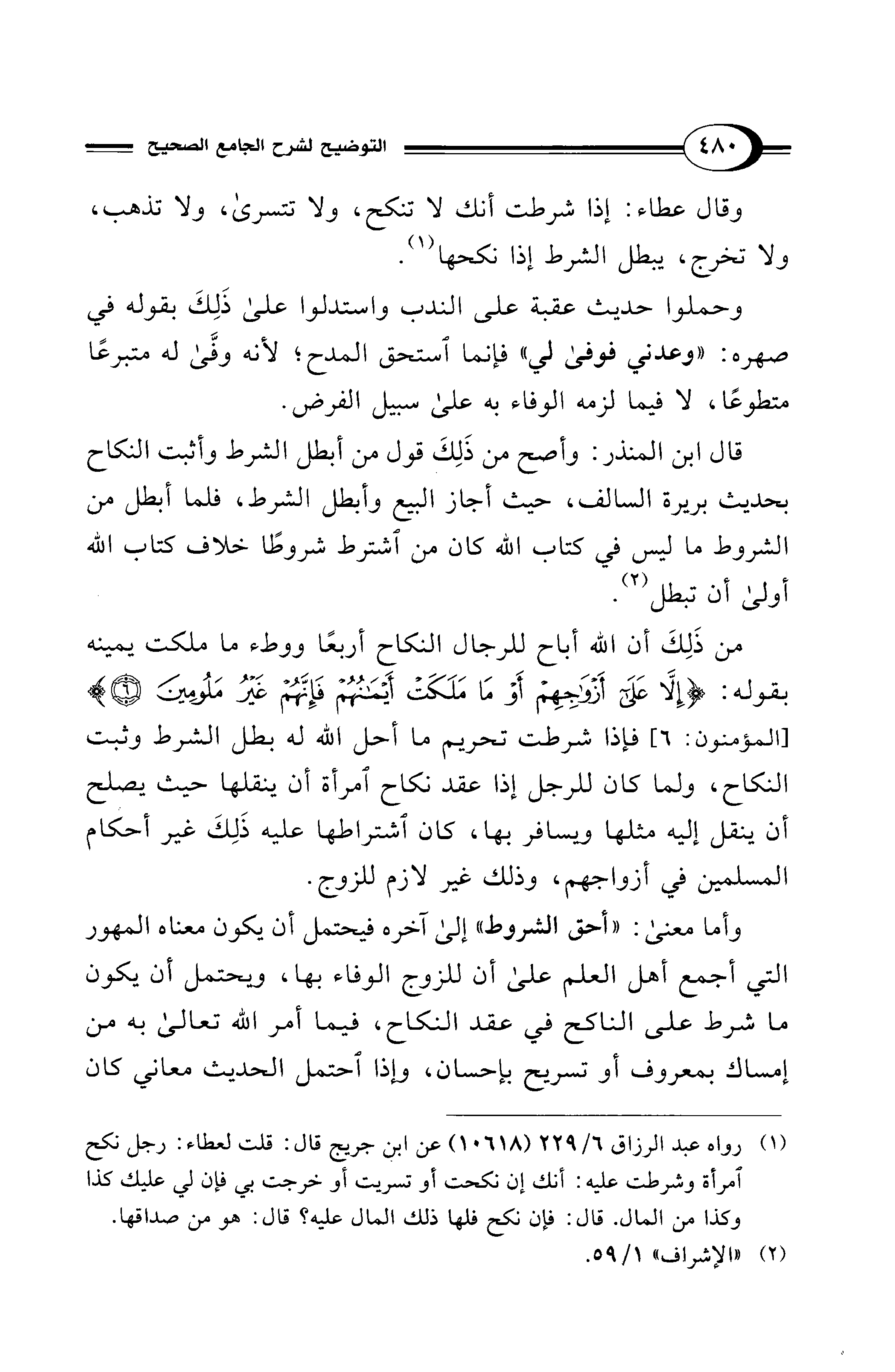 من ذَلِكَ أن الله أباح للرجال النكاح أربعًا ووطء ما ملكت يمينه بقوله: {إِلَّا على أَزْوَاجِهِمْ أَوْ مَا مَلَكَتْ أَيْمَانُهُمْ فَإِنَّهُمْ غَيْرُ مَلُومِينَ (6)} [المؤمنون: 6] فإذا شرطت تحريم ما أحل الله له بطل الشرط وثبت النكاح، ولما كان للرجل إذا عقد نكاح امرأة أن ينقلها حيث يصلح أن ينقل إليه مثلها ويسافر بها، كان اشتراطها عليه ذَلِكَ غير أحكام المسلمين في أزواجهم، وذلك غير لازم للزوج.