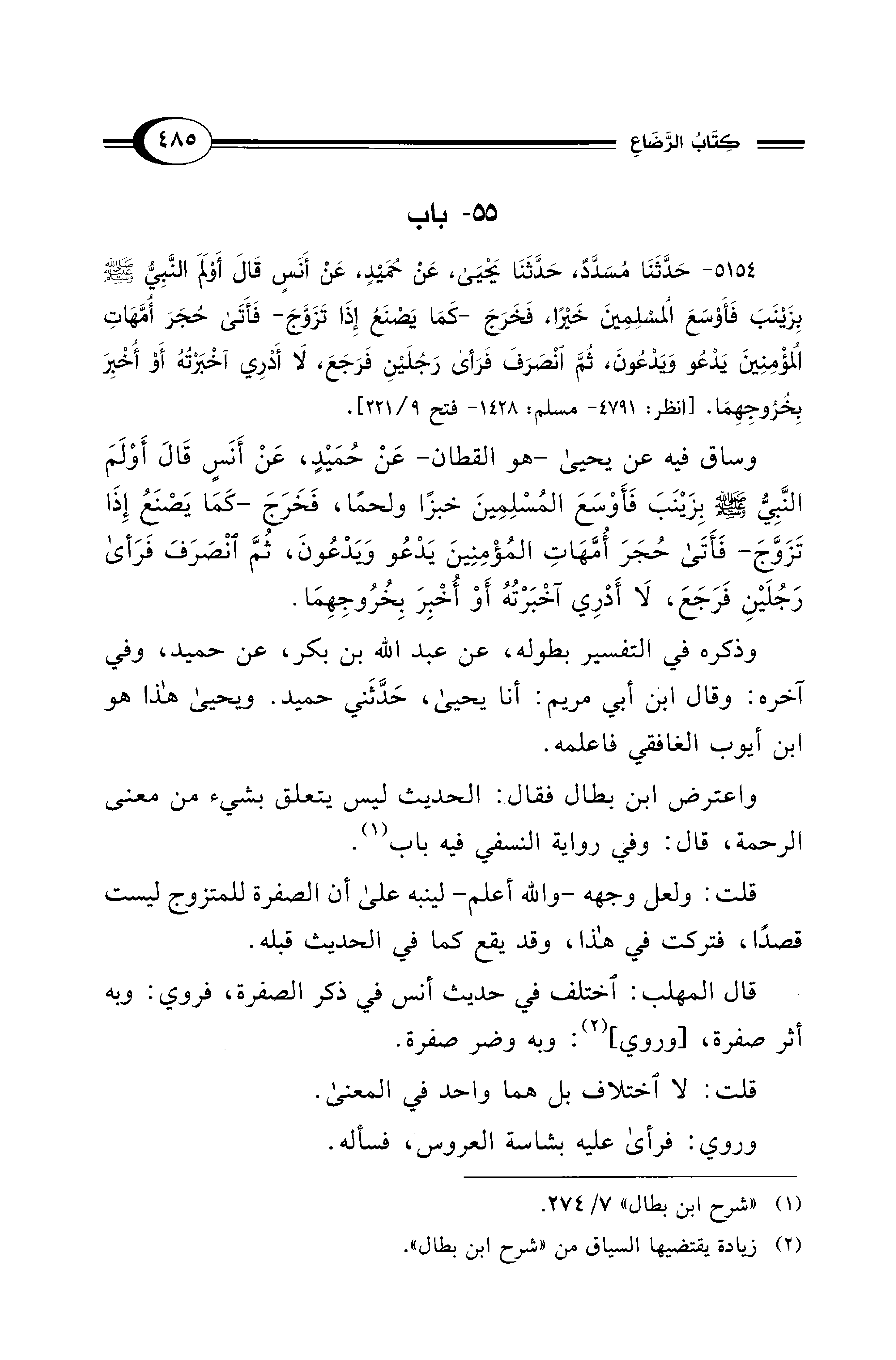 5154 - حَدَّثَنَا مُسَدَّدٌ, حَدَّثَنَا يَحْيَى, عَنْ حُمَيْدٍ, عَنْ أَنَسٍ قَالَ أَوْلَمَ النَّبِيُّ - صلى الله عليه وسلم - بِزَيْنَبَ فَأَوْسَعَ الْمُسْلِمِينَ خَيْرًا, فَخَرَجَ -كَمَا يَصْنَعُ إِذَا تَزَوَّجَ - فَأَتَى حُجَرَ أُمَّهَاتِ الْمُؤْمِنِينَ يَدْعُو وَيَدْعُونَ, ثُمَّ انْصَرَفَ فَرَأَى رَجُلَيْنِ فَرَجَعَ, لاَ أَدْرِي آخْبَرْتُهُ أَوْ أُخْبِرَ بِخُرُوجِهِمَا. [انظر: 4791 - مسلم: 1428 - فتح 9/ 221].