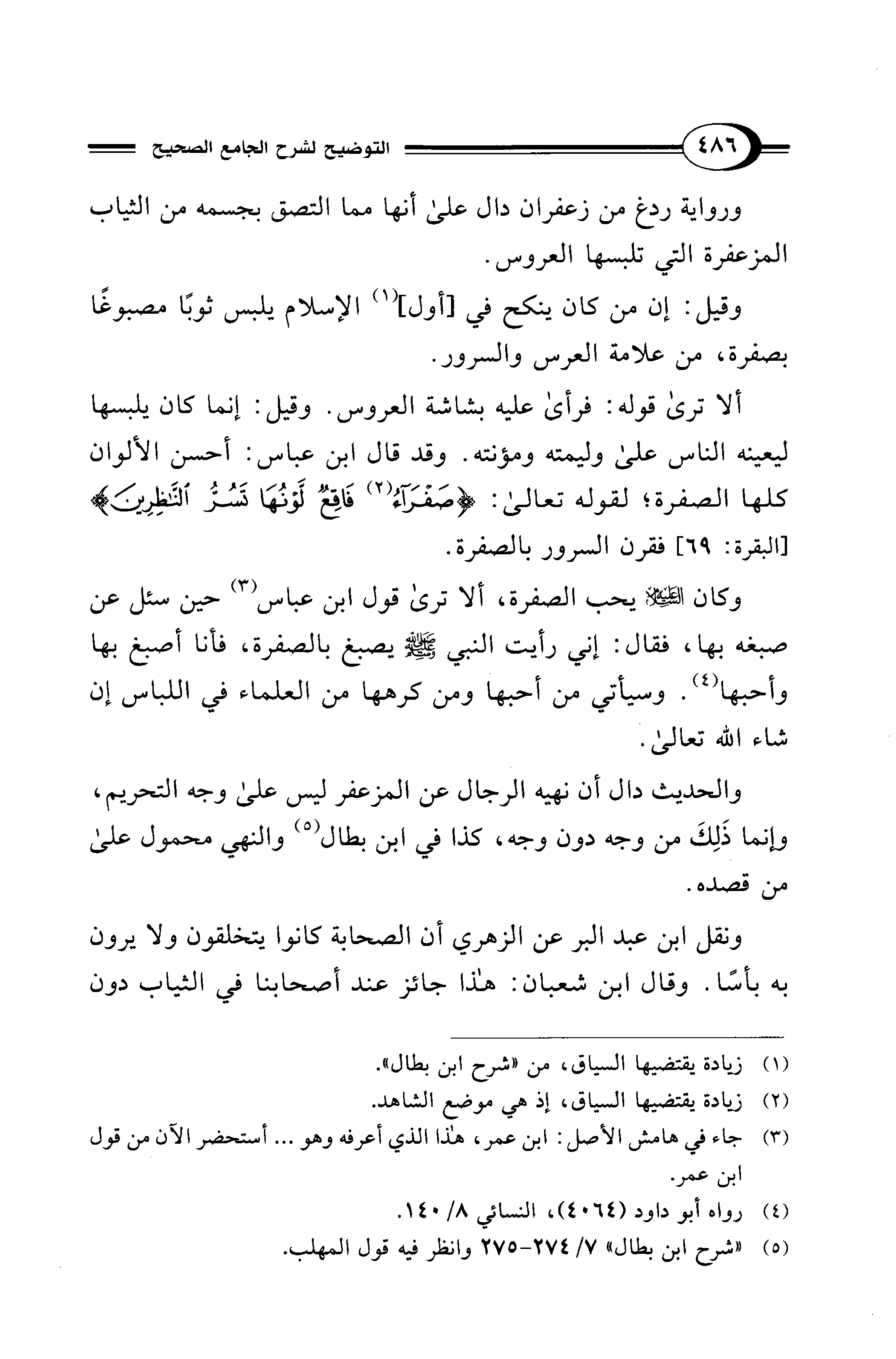 ألا ترى قوله: فرأى عليه بشاشة العروس. وقيل: إنما كان يلبسها ليعينه الناس على وليمته ومؤنته. وقد قال ابن عباس: أحسن الألوان كلها الصفرة؛ لقوله تعالى: {صَفْرَاءُ (¬2) فَاقِعٌ لَوْنُهَا تَسُرُّ النَّاظِرِينَ} [البقرة: 69] فقرن السرور بالصفرة.
