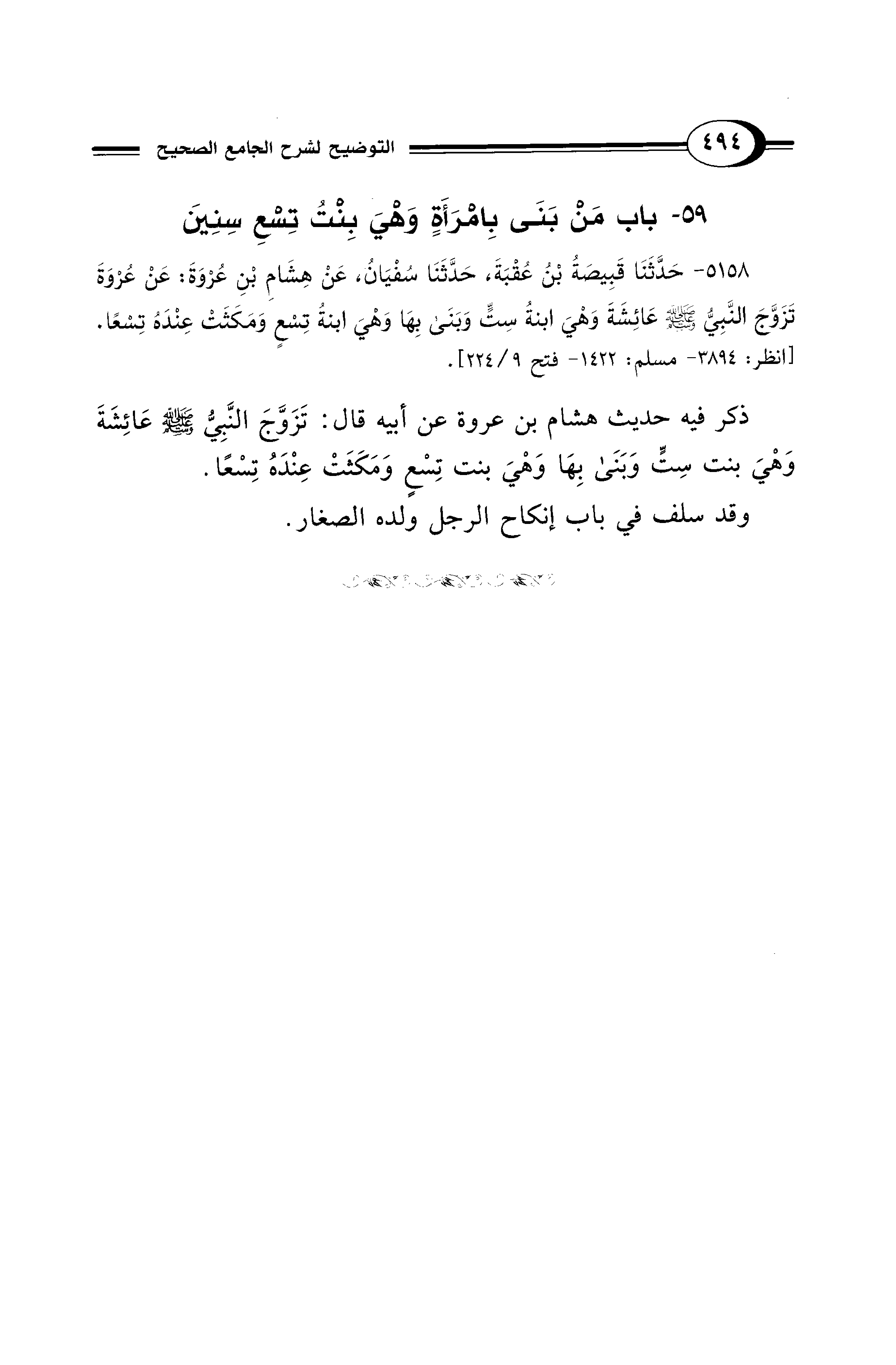 5158 - حَدَّثَنَا قَبِيصَةُ بْنُ عُقْبَةَ, حَدَّثَنَا سُفْيَانُ, عَنْ هِشَامِ بْنِ عُرْوَةَ: عَنْ عُرْوَةَ تَزَوَّجَ النَّبِيُّ - صلى الله عليه وسلم - عَائِشَةَ وَهْيَ ابْنَةُ سِتٍّ وَبَنَى بِهَا وَهْيَ ابْنَةُ تِسْعٍ وَمَكَثَتْ عِنْدَهُ تِسْعًا. [انظر: 3894 - مسلم: 1422 - فتح 9/ 224].