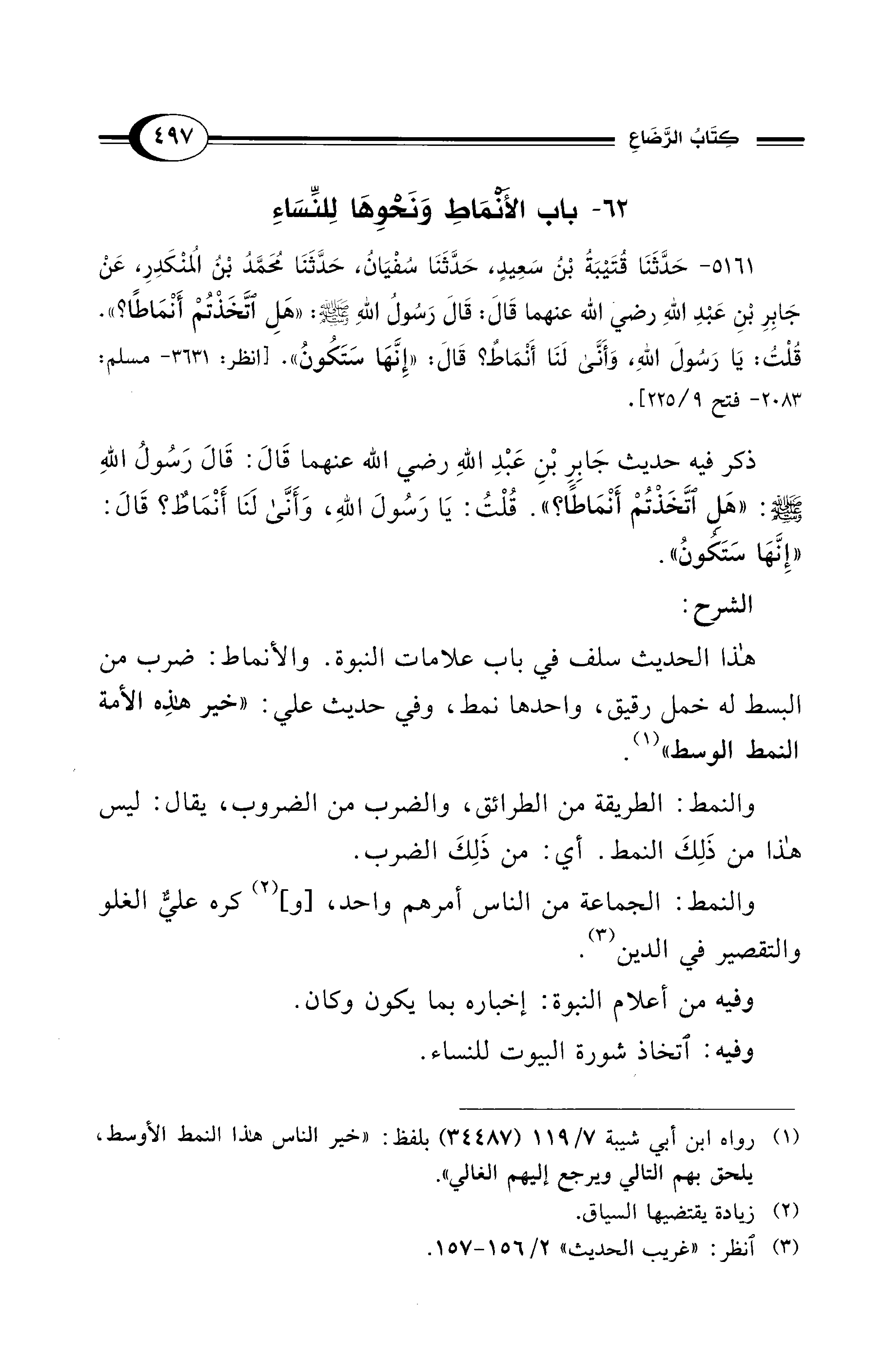 5161 - حَدَّثَنَا قُتَيْبَةُ بْنُ سَعِيدٍ حَدَّثَنَا سُفْيَانُ, حَدَّثَنَا مُحَمَّدُ بْنُ الْمُنْكَدِرِ, عَنْ جَابِرِ بْنِ عَبْدِ اللهِ - رضي الله عنهما -قَالَ: قَالَ رَسُولُ اللهِ - صلى الله عليه وسلم -: «هَلِ اتَّخَذْتُمْ أَنْمَاطًا؟». قُلْتُ: يَا رَسُولَ اللهِ, وَأَنَّى لَنَا أَنْمَاطٌ؟ قَالَ: «إِنَّهَا سَتَكُونُ». [انظر: 3631 - مسلم: 2083 - فتح 9/ 225].