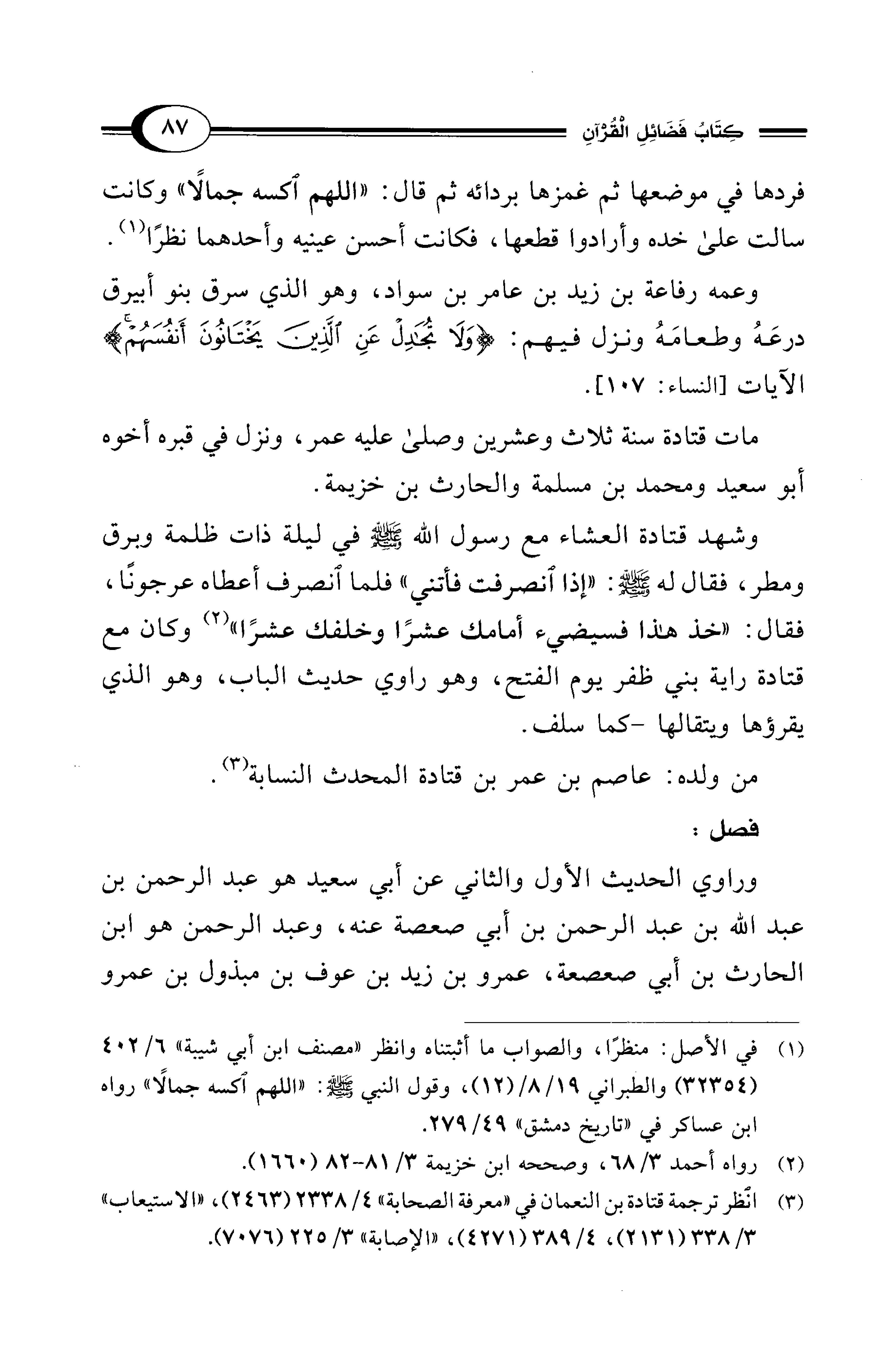 (¬3) انظر ترجمة قتادة بن النعمان في "معرفة الصحابة" 4/ 2338 (2463)، "الاستيعاب" 3/ 338 (2131)، 4/ 389 (4271)، "الإصابة" 3/ 225 (7076).