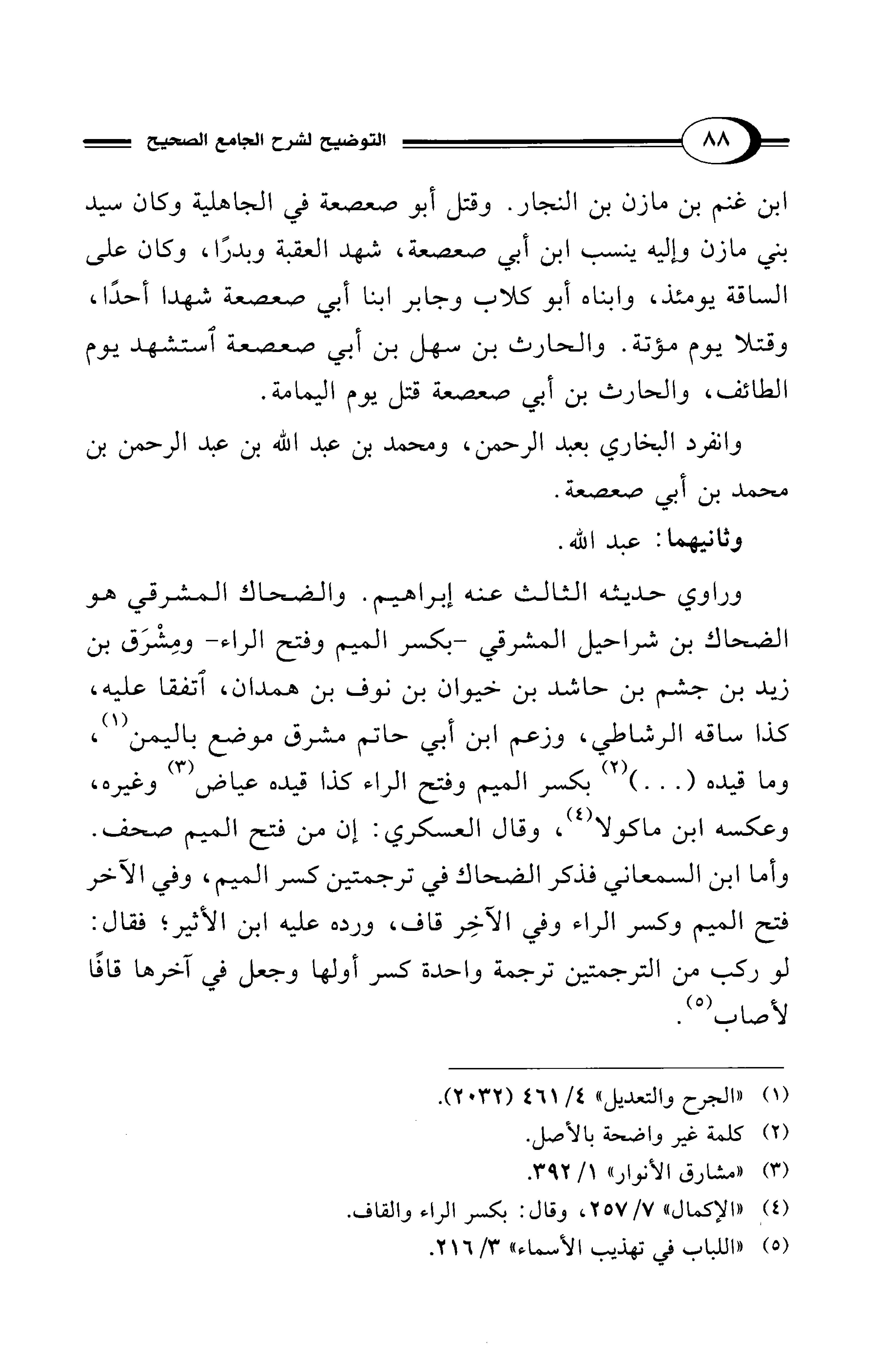 وراوي حديثه الثالث عنه إبراهيم. والضحاك المشرقي هو الضحاك بن شراحيل المشرقي -بكسر الميم وفتح الراء- ومِشْرَق بن زيد بن جشم بن حاشد بن خيوان بن نوف بن همدان، اتفقا عليه، كذا ساقه الرشاطي، وزعم ابن أبي حاتم مشرق موضع باليمن (¬1)، وما قيده (...) (¬2) بكسر الميم وفتح الراء كذا قيده عياض (¬3) وغيره، وعكسه ابن ماكولا (¬4)، وقال العسكري: إن من فتح الميم صحف. وأما ابن السمعاني فذكر الضحاك في ترجمتين كسر الميم، وفي الآخر فتح الميم وكسر الراء وفي الآخِر قاف، ورده عليه ابن الأثير؛ فقال: لو ركب من الترجمتين ترجمة واحدة كسر أولها وجعل في آخرها قافًا لأصاب (¬5).