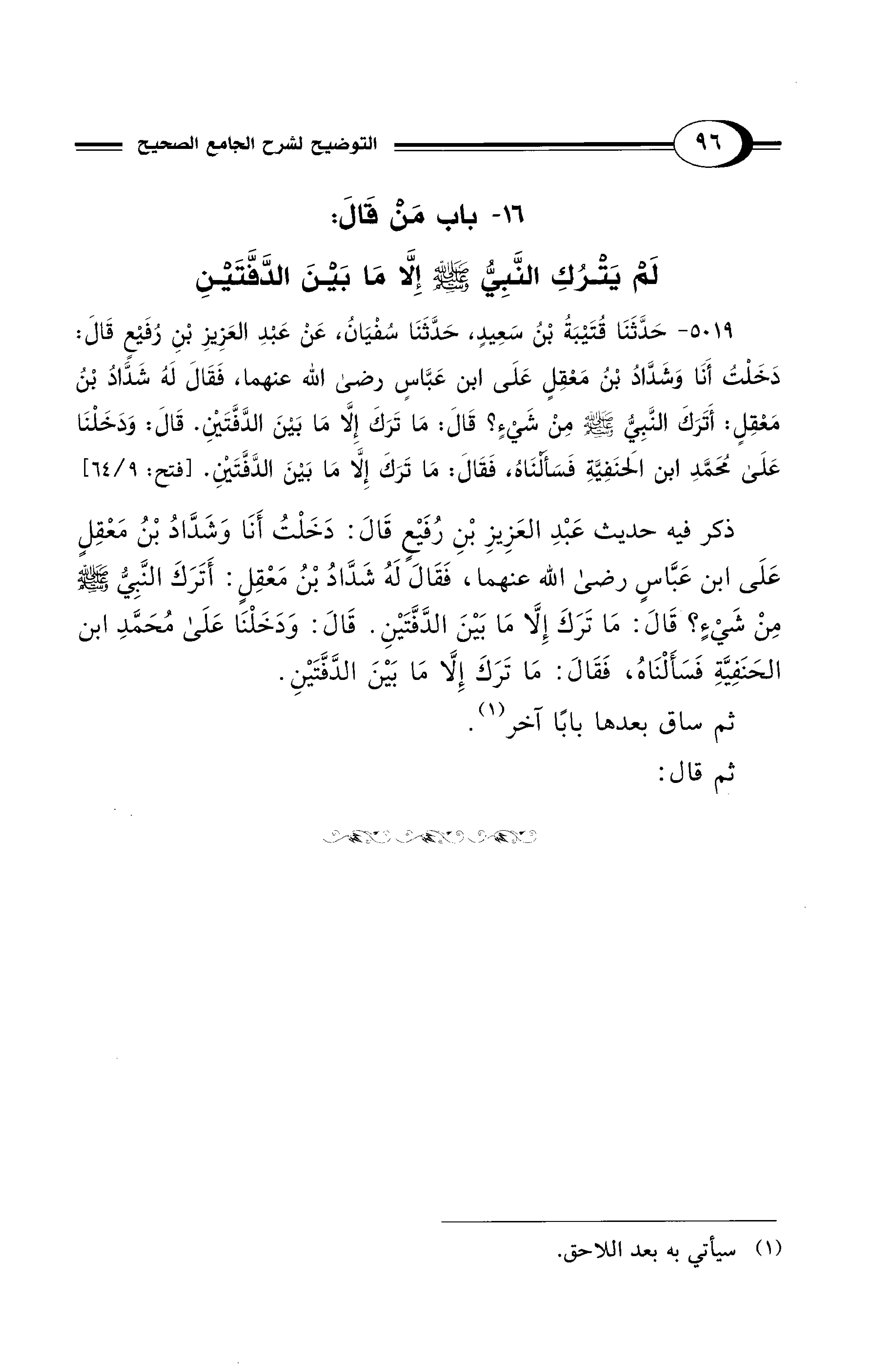 ذكر فيه حديث عَبْدِ العَزِيزِ بْنِ رُفَيْعٍ قَالَ: دَخَلْتُ أَنَا وَشَدَّادُ بْنُ مَعْقِلٍ عَلَى ابن عَبَّاسٍ رضي الله عنهما، فَقَالَ لَهُ شَدَّادُ بْنُ مَعْقِلٍ: أَتَرَكَ النَّبِيُّ - صلى الله عليه وسلم - مِنْ شَيءٍ؟ قَالَ: مَا تَرَكَ إِلَّا مَا بَيْنَ الدَّفَّتَيْنِ. قَالَ: وَدَخَلْنَا عَلَى مُحَمَّدِ ابن الحَنَفِيَّةِ فَسَأَلْنَاهُ، فَقَالَ: مَا تَرَكَ إِلَّا مَا بَيْنَ الدَّفَّتَيْنِ.