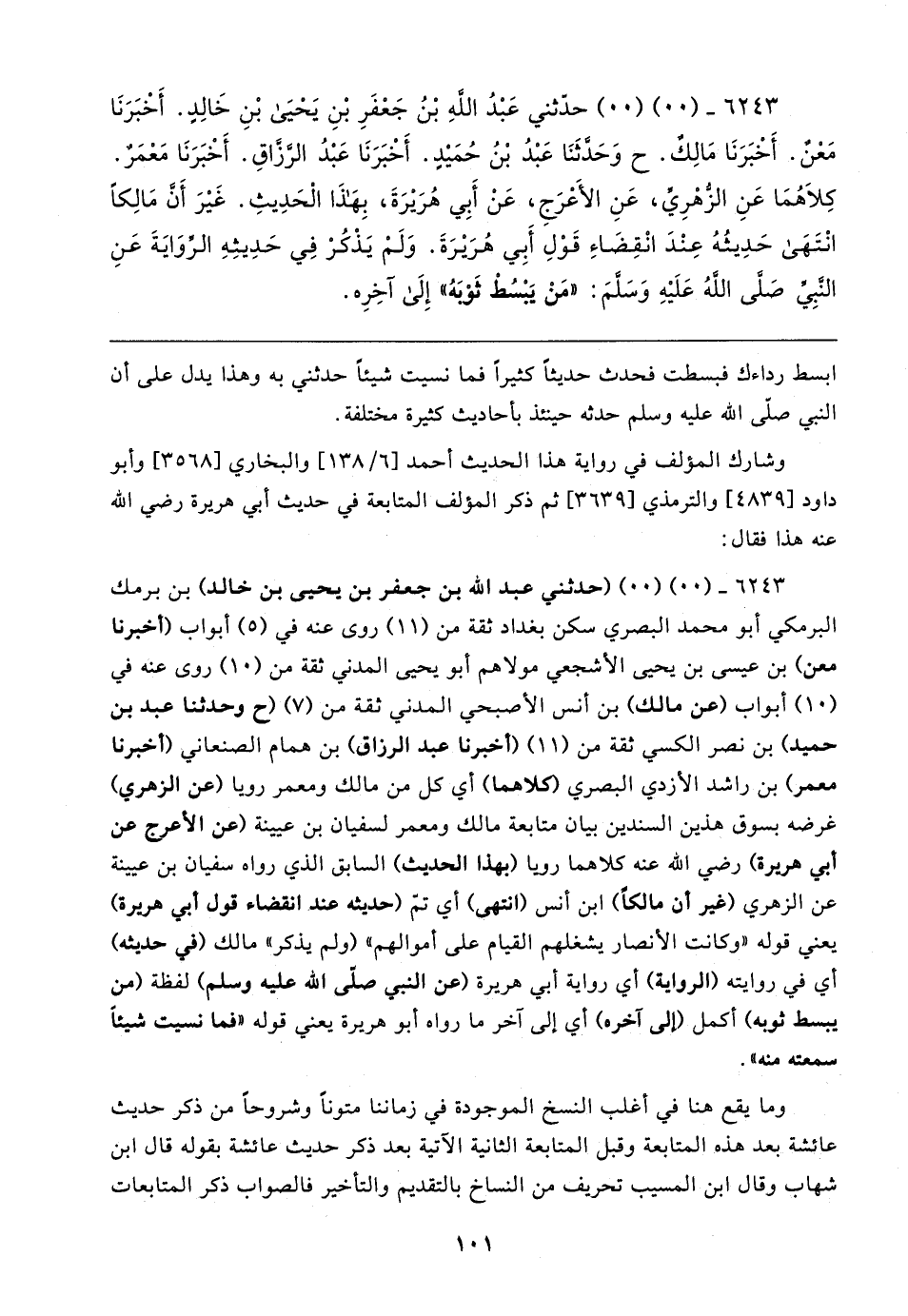 ٦٢٤٣ - (٠٠) (٠٠) حدّثني عَبْدُ اللهِ بْنُ جَعْفَرِ بْنِ يَحْيَى بْنِ خَالِدٍ. أَخْبَرَنَا مَعْنٌ. أَخْبَرَنَا مَالِكٌ. ح وَحَدَّثَنَا عَبْدُ بْنُ حُمَيدٍ. أَخْبَرَنَا عَبْدُ الرَّزَّاقِ. أَخْبَرَنَا مَعْمَرٌ. كِلاهُمَا عَنِ الزُّهْرِيِّ، عَنِ الأَعْرَجِ، عَنْ أَبِي هُرَيرَةَ، بِهَذَا الْحَدِيثِ. غَيرَ أَنَّ مَالِكًا انْتَهَى حَدِيثُهُ عِنْدَ انْقِضَاءِ قَوْلِ أَبِي هُرَيرَةَ. وَلَمْ يَذْكُرْ فِي حَدِيثِهِ الرِّوَايَةَ عَنِ النَّبِيِّ صَلَّى اللهُ عَلَيهِ وَسَلَّمَ: "مَنْ يَبْسُطْ ثَوْبَهُ" إِلَي آخِرِه