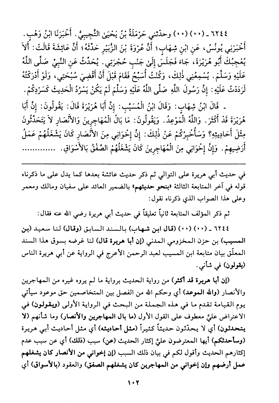 ٦٢٤٤ - (٠٠) (٠٠) وحدَّثني حَرْمَلَةُ بْنُ يَحْيَى التُّجِيبِيُّ. أَخبَرَنَا ابْنُ وَهْبٍ. أَخْبَرَنِي يُونُسُ، عَنِ ابْنِ شِهَابٍ؛ أَنَّ عُرْوَةَ بْنَ الزُّبَيرِ حَدَّثَهُ؛ أَنَّ عَائِشَةَ قَالت: أَلا يُعْجِبُكَ أَبُو هُرَيرَةَ، جَاءَ فَجَلَسَ إِلَى جَنْبِ حُجْرَتِي. يُحَدِّثُ عَنِ النَّبِيِّ صَلَّى اللهُ عَلَيهِ وَسَلَّمَ. يُسْمِعُنِي ذلِكَ، وَكُنْتُ أُسَبِّحُ فَقَامَ قَبْلَ أَنْ أَقْضِيَ سُبْحَتِي، وَلَوْ أَدْرَكْتُهُ لَرَدَدْتُ عَلَيهِ: إِنَّ رَسُولَ اللهِ صَلَّى اللهُ عَلَيهِ وَسَلَّمَ لَمْ يَكُنْ يَسْرُدُ الْحَدِيثَ كَسَرْدِكُمْ.