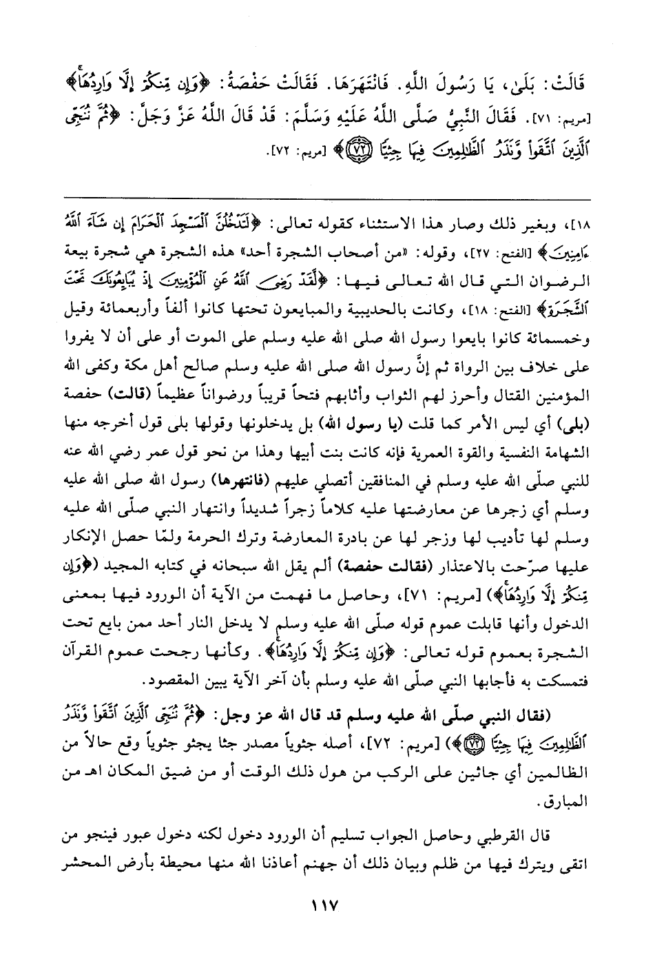 قَالتْ: بَلَى، يَا رَسُولَ اللهِ. فَانْتَهَرَهَا. فَقَالتْ حَفْصَةُ: {وَإِنْ مِنْكُمْ إلا وَارِدُهَا} [مريم: ٧١]. فَقَال النَّبِي صَلَّى اللهُ عَلَيهِ وَسَلَّمَ: قَدْ قَال اللهُ عَز وَجَل: {ثُمَّ نُنَجِّي الَّذِينَ اتَّقَوْا وَنَذَرُ الظَّالِمِينَ فِيهَا جِثِيًّا (٧٢)} [مريم: ٧٢]