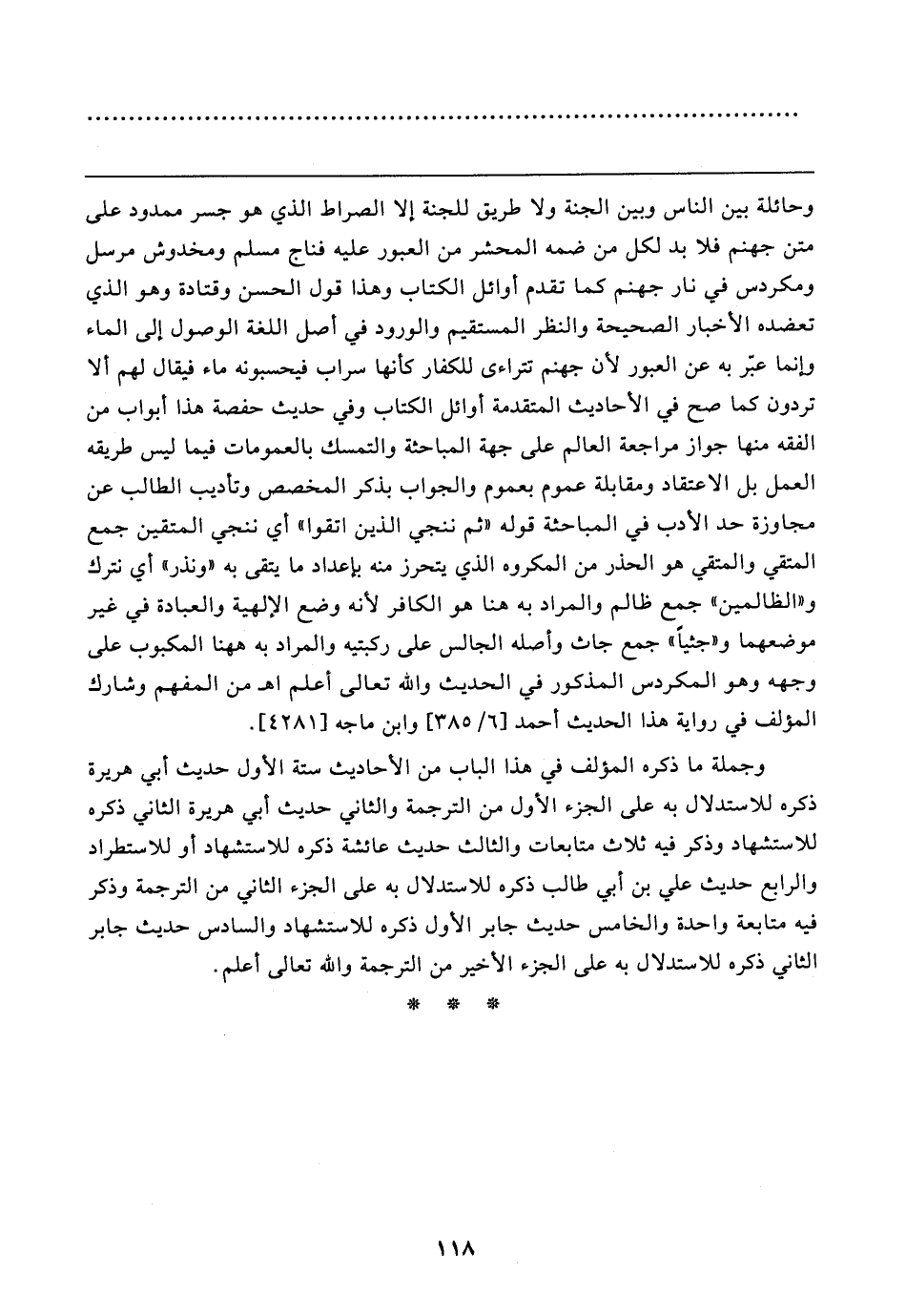 وحائلة بين الناس وبين الجنة ولا طريق للجنة إلا الصراط الذي هو جسر ممدود على متن جهنم فلا بد لكل من ضمه المحشر من العبور عليه فناج مسلم ومخدوش مرسل ومكردس في نار جهنم كما تقدم أوائل الكتاب وهذا قول الحسن وقتادة وهو الذي تعضده الأخبار الصحيحة والنظر المستقيم والورود في أصل اللغة الوصول إلى الماء وإنما عبّر به عن العبور لأن جهنم تتراءى للكفار كأنها سراب فيحسبونه ماء فيقال لهم ألا تردون كما صح في الأحاديث المتقدمة أوائل الكتاب وفي حديث حفصة هذا أبواب من الفقه منها جواز مراجعة العالم على جهة المباحثة والتمسك بالعمومات فيما ليس طريقه العمل بل الاعتقاد ومقابلة عموم بعموم والجواب بذكر المخصص وتأديب الطالب عن مجاوزة حد الأدب في المباحثة قوله "ثم ننجي الذين اتقوا" أي ننجي المتقين جمع المتقي والمتقي هو الحذر من المكروه الذي يتحرز منه بإعداد ما يتقى به "ونذر" أي نترك و"الظالمين" جمع ظالم والمراد به هنا هو الكافر لأنه وضع الإلهية والعبادة في غير موضعهما و"جثيًا" جمع جاث وأصله الجالس على ركبتيه والمراد به ها هنا المكبوب على وجهه وهو المكردس المذكور في الحديث والله تعالى أعلم اهـ من المفهم وشارك المؤلف في رواية هذا الحديث أحمد [٦/ ٣٨٥] وابن ماجه [٤٢٨١].