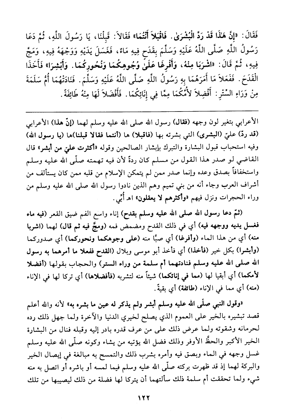 "وقول النبي صلى الله عليه وسلم أبشر ولم يذكر له عين ما بشره به" لأنه والله أعلم قصد تبشيره بالخير على العموم الذي يصلح لخيري الدنيا والآخرة ولما جهل ذلك رده لحرمانه وشقوته ولما عرض ذلك على من عرف قدره بادر إليه وقبله فنال من البشارة الخير الأكبر والحظَّ الأوفر وذلك فضل الله يؤتيه من يشاء وكونه صلى الله عليه وسلم غسل وجهه في الماء وبصق فيه وأمره بشرب ذلك والتمسح به مبالغة في إيصال الخير والبركة لهما إذ قد ظهرت بركته صلى الله عليه وسلم فيما لمسه أو باشره أو اتصل به منه شيء ولما تحققت أم سلمة ذلك سألتهما أن يتركا لها فضلة من ذلك ليصيبها من تلك