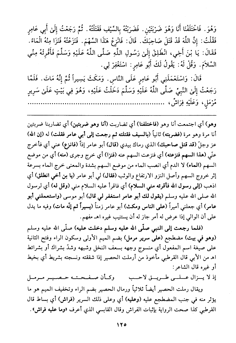 وَهُوَ. فَاخْتَلَفْنَا أَنَا وَهُوَ ضَرْبَتَينِ. فَضَرَبْتُهُ بِالسَّيفِ فَقَتَلْتُهُ. ثُمَّ رَجَعْتُ إِلَى أَبِي عَامِرٍ فَقُلْتُ: إِن اللهَ قَدْ قَتَلَ صَاحِبَكَ. قَال: فَانْزِعْ هذَا السَّهْمَ. فَنَزَعْتُهُ فَنَزَا مِنْهُ الْمَاءُ. فَقَال: يَا بْنَ أَخِي، انْطَلِقْ إِلَى رَسُولِ اللهِ صَلَّى اللهُ عَلَيهِ وَسَلَّمَ فَأَقْرِئْهُ مِنِّي السَّلامَ. وَقُلْ لَهُ: يَقُولُ لَكَ أَبُو عَامِرٍ: اسْتَغْفِرْ لِي.