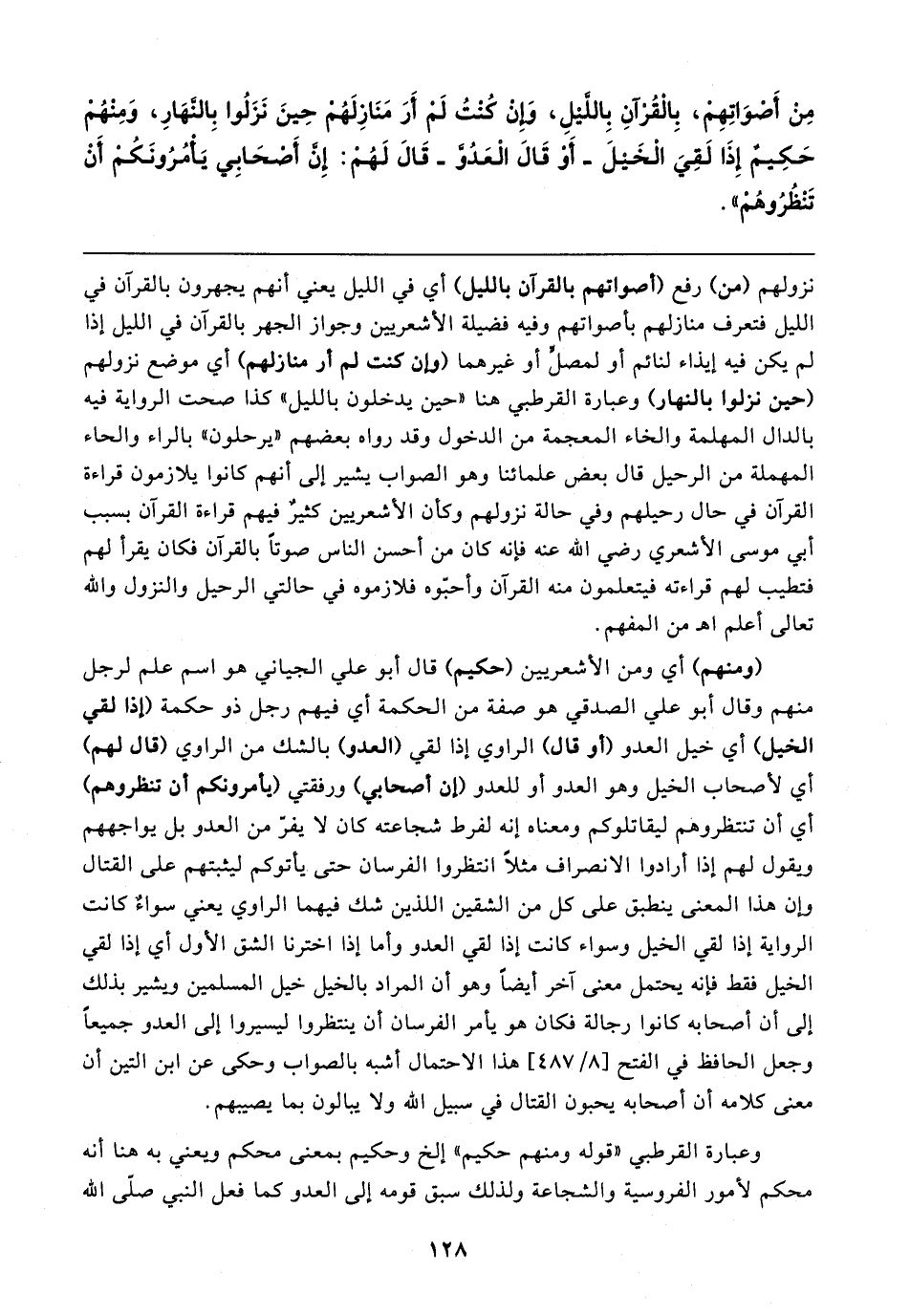 (ومنهم) أي ومن الأشعريين (حكيم) قال أبو علي الجياني هو اسم علم لرجل منهم وقال أبو علي الصدقي هو صفة من الحكمة أي فيهم رجل ذو حكمة (إذا لقي الخيل) أي خيل العدو (أو قال) الراوي إذا لقي (العدو) بالشك من الراوي (قال لهم) أي لأصحاب الخيل وهو العدو أو للعدو (إن أصحابي) ورفقتي (يأمرونكم أن تنظروهم) أي أن تنتظروفم ليقاتلوكم ومعناه إنه لفرط شجاعته كان لا يفرّ من العدو بل يواجههم ويقول لهم إذا أرادوا الانصراف مثلًا انتظروا الفرسان حتى يأتوكم ليثبتهم على القتال وإن هذا المعنى ينطبق على كل من الشقين اللذين شك فيهما الراوي يعني سواءٌ كانت الرواية إذا لقي الخيل وسواء كانت إذا لقي العدو وأما إذا اخترنا الشق الأول أي إذا لقي الخيل فقط فإنه يحتمل معنى آخر أيضًا وهو أن المراد بالخيل خيل المسلمين ويشير بذلك إلى أن أصحابه كانوا رجالة فكان هو يأمر الفرسان أن ينتظروا ليسيروا إلى العدو جميعًا وجعل الحافظ في الفتح [٨/ ٤٨٧] هذا الاحتمال أشبه بالصواب وحكى عن ابن التين أن معنى كلامه أن أصحابه يحبون القتال في سبيل الله ولا يبالون بما يصيبهم.