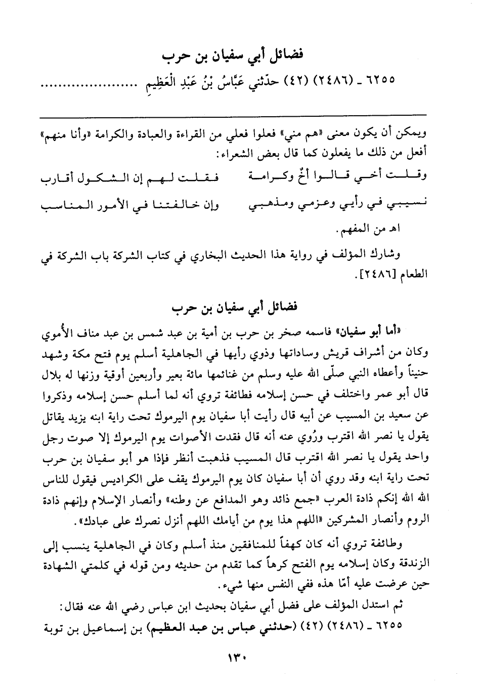 ثم استدل المؤلف على فضل أبي سفيان بحديث ابن عباس رضي الله عنه فقال: