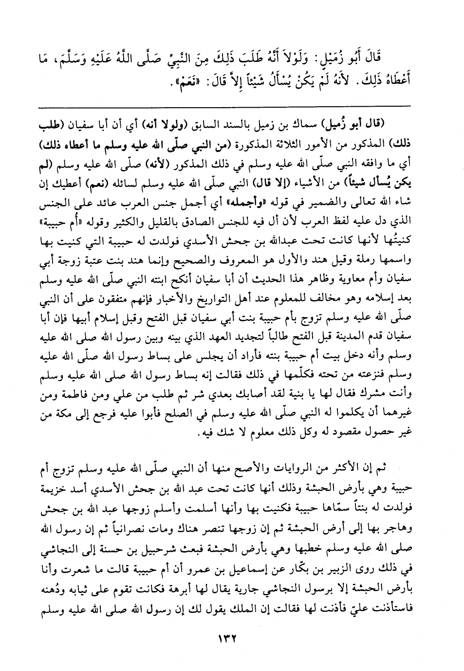(قال أبو زُميل) سماك بن زميل بالسند السابق (ولولا أنَّه) أي أن أبا سفيان (طلب ذلك) المذكور من الأمور الثلاثة المذكورة (من النبي صلى الله عليه وسلم ما أعطاه ذلك) أي ما وافقه النبي صلَّى الله عليه وسلم في ذلك المذكور (لأنه) صلى الله عليه وسلم (لم يكن يُسأل شيئًا) من الأشياء (إلا قال) النبي صلى الله عليه وسلم لسائله (نعم) أعطيك إن شاء الله تعالى والضمير في قوله "وأجمله" أي أجمل جنس العرب عائد على الجنس الذي دل عليه لفظ العرب لأن أل فيه للجنس الصادق بالقليل والكثير وقوله "أُم حبيبة" كنيتُها لأنها كانت تحت عبد الله بن جحش الأسدي فولدت له حبيبة التي كنيت بها واسمها رملة وقيل هند والأول هو المعروف والصحيح وإنما هند بنت عتبة زوجة أبي سفيان وأم معاوية وظاهر هذا الحديث أن أبا سفيان أنكح ابنته النبي صلى الله عليه وسلم بعد إسلامه وهو مخالف للمعلوم عند أهل التواريخ والأخبار فإنهم متفقون على أن النبي صلى الله عليه وسلم تزوج بام حبيبة بنت أبي سفيان قبل الفتح وقبل إسلام أبيها فإن أبا سفيان قدم المدينة قبل الفتح طالبًا لتجديد العهد الذي بينه وبين رسول الله صلى الله عليه وسلم وأنه دخل بيت أم حبيبة بنته فأراد أن يجلس على بساط رسول الله صلى الله عليه وسلم فنزعته من تحته فكلّمها في ذلك فقالت إنه بساط رسول الله صلى الله عليه وسلم وأنت مشرك فقال لها يا بنية لقد أصابك بعدي شر ثم طلب من علي ومن فاطمة ومن غيرهما أن يكلموا له النبي صلَّى الله عليه وسلم في الصلح فأبوا عليه فرجع إلى مكة من غير حصول مقصود له وكل ذلك معلوم لا شك فيه.