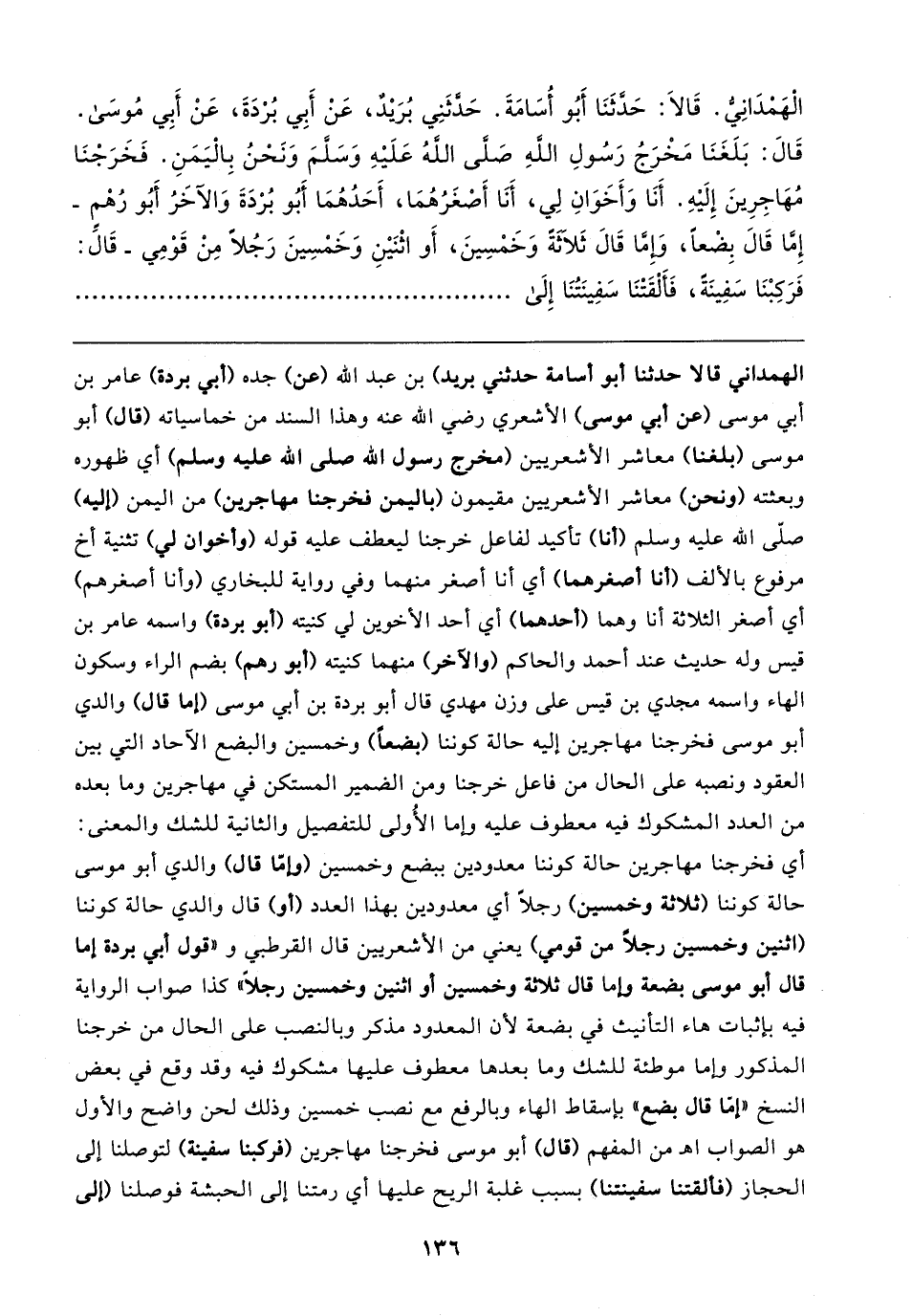 الْهَمْدَانِيُّ. قَالا: حَدَّثَنَا أَبُو أُسَامَةَ. حَدَّثَنِي بُرَيدٌ، عَنْ أَبِي بُرْدَةَ، عَنْ أَبِي مُوسَى. قَال: بَلَغَنَا مَخْرَجُ رَسُولِ اللهِ صَلَّى اللهُ عَلَيهِ وَسَلَّمَ وَنَحْنُ بِالْيَمَنِ. فَخَرَجْنَا مُهَاجِرِينَ إِلَيهِ. أَنَا وَأَخَوَانِ لِي، أَنَا أَصْغَرُهُمَا، أَحَدُهُمَا أَبُو بُرْدَةَ وَالآخَرُ أَبُو رُهْمٍ -إِمَّا قَال بِضْعًا، وَإِمَّا قَال ثَلاثَةً وَخَمْسِينَ، أَو اثْنَينِ وَخَمْسِينَ رَجُلًا مِنْ قَوْمِي- قَال: فَرَكِبْنَا سَفِينَةً، فَألْقَتْنَا سَفِينَتُنَا إِلَى