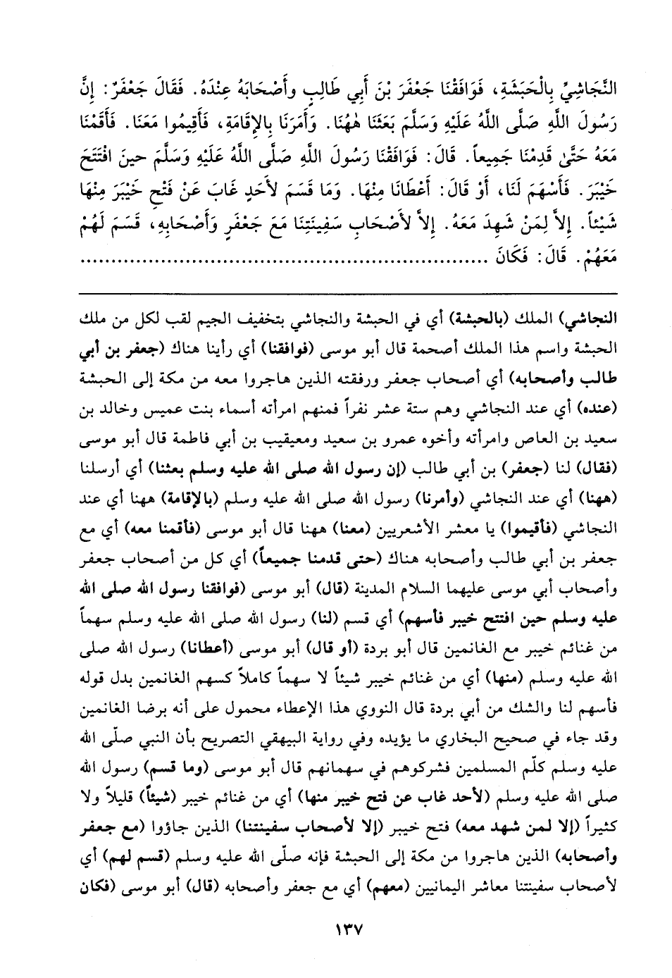 النجاشي) الملك (بالحبشة) أي في الحبشة والنجاشي بتخفيف الجيم لقب لكل من ملك الحبشة واسم هذا الملك أصحمة قال أبو موسى (فوافقنا) أي رأينا هناك (جعفر بن أبي طالب وأصحابه) أي أصحاب جعفر ورفقته الذين هاجروا معه من مكة إلى الحبشة (عنده) أي عند النجاشي وهم ستة عشر نفرًا فمنهم امرأته أسماء بنت عميس وخالد بن سعيد بن العاص وامرأته وأخوه عمرو بن سعيد ومعيقيب بن أبي فاطمة قال أبو موسى (فقال) لنا (جعفر) بن أبي طالب (إن رسول الله صلى الله عليه وسلم بعثنا) أي أرسلنا (ها هنا) أي عند النجاشي (وأمرنا) رسول الله صلى الله عليه وسلم (بالإقامة) ها هنا أي عند النجاشي (فأقيموا) يا معشر الأشعريين (معنا) ها هنا قال أبو موسى (فأقمنا معه) أي مع جعفر بن أبي طالب وأصحابه هناك (حتى قدمنا جميعًا) أي كل من أصحاب جعفر وأصحاب أبي موسى عليهما السلام المدينة (قال) أبو موسى (فوافقنا رسول الله صلى الله عليه وسلم حين افتتح خيبر فأسهم) أي قسم (لنا) رسول الله صلى الله عليه وسلم سهمًا من غنائم خيبر مع الغانمين قال أبو بردة (أو قال) أبو موسى (أعطانا) رسول الله صلى الله عليه وسلم (منها) أي من غنائم خيبر شيئًا لا سهمًا كاملًا كسهم الغانمين بدل قوله فأسهم لنا والشك من أبي بردة قال النووي هذا الإعطاء محمول على أنه برضا الغانمين وقد جاء في صحيح البخاري ما يؤيده وفي رواية البيهقي التصريح بأن النبي صلى الله عليه وسلم كلّم المسلمين فشركوهم في سهمانهم قال أبو موسى (وما قسم) رسول الله صلى الله عليه وسلم (لأحد غاب عن فتح خيبر منها) أي من غنائم خيبر (شيئًا) قليلًا ولا كثيرًا (إلا لمن شهد معه) فتح خيبر (إلا لأصحاب سفينتنا) الذين جاؤوا (مع جعفر وأصحابه) الذين هاجروا من مكة إلى الحبشة فإنه صلى الله عليه وسلم (قسم لهم) أي لأصحاب سفينتنا معاشر اليمانيين (معهم) أي مع جعفر وأصحابه (قال) أبو موسى (فكان
