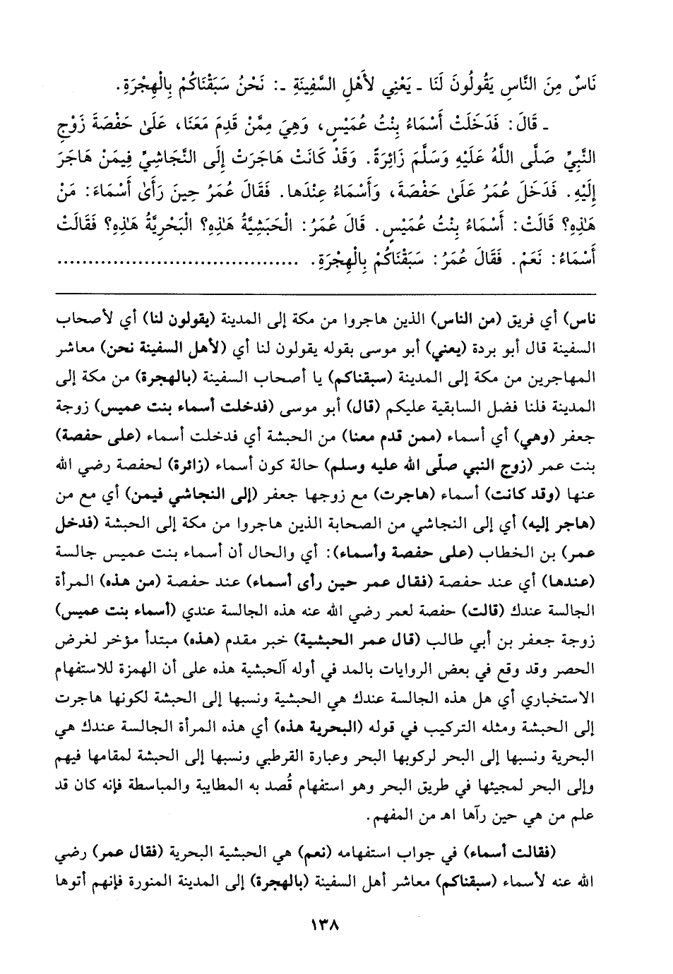 - قَال: فَدَخَلَتْ أَسْمَاءُ بِنْتُ عُمَيسٍ، وَهِيَ مِمَّنْ قَدِمَ مَعَنَا، عَلَى حَفْصَةَ زَوْجِ النَّبِيّ صَلَّى اللهُ عَلَيهِ وَسَلَّمَ زَائِرَةً. وَقَدْ كَانَتْ هَاجَرَتْ إِلَى النَّجَاشِيِّ فِيمَنْ هَاجَرَ إِلَيهِ. فَدَخَلَ عُمَرُ عَلَى حَفْصَةَ، وَأَسْمَاءُ عِنْدَها. فَقَال عُمَرُ حِينَ رَأَى أَسْمَاءَ: مَنْ هذِهِ؟ قَالتْ: أَسْمَاءُ بِنْتُ عُمَيسٍ. قَال عُمَرُ: الْحَبَشِيَّةُ هذِهِ؟ الْبَحْرِيَّةُ هذِهِ؟ فَقَالتْ أَسْمَاءُ: نَعَمْ. فَقَال عُمَرُ: سَبَقْنَاكُمْ بِالْهِجْرَةِ
