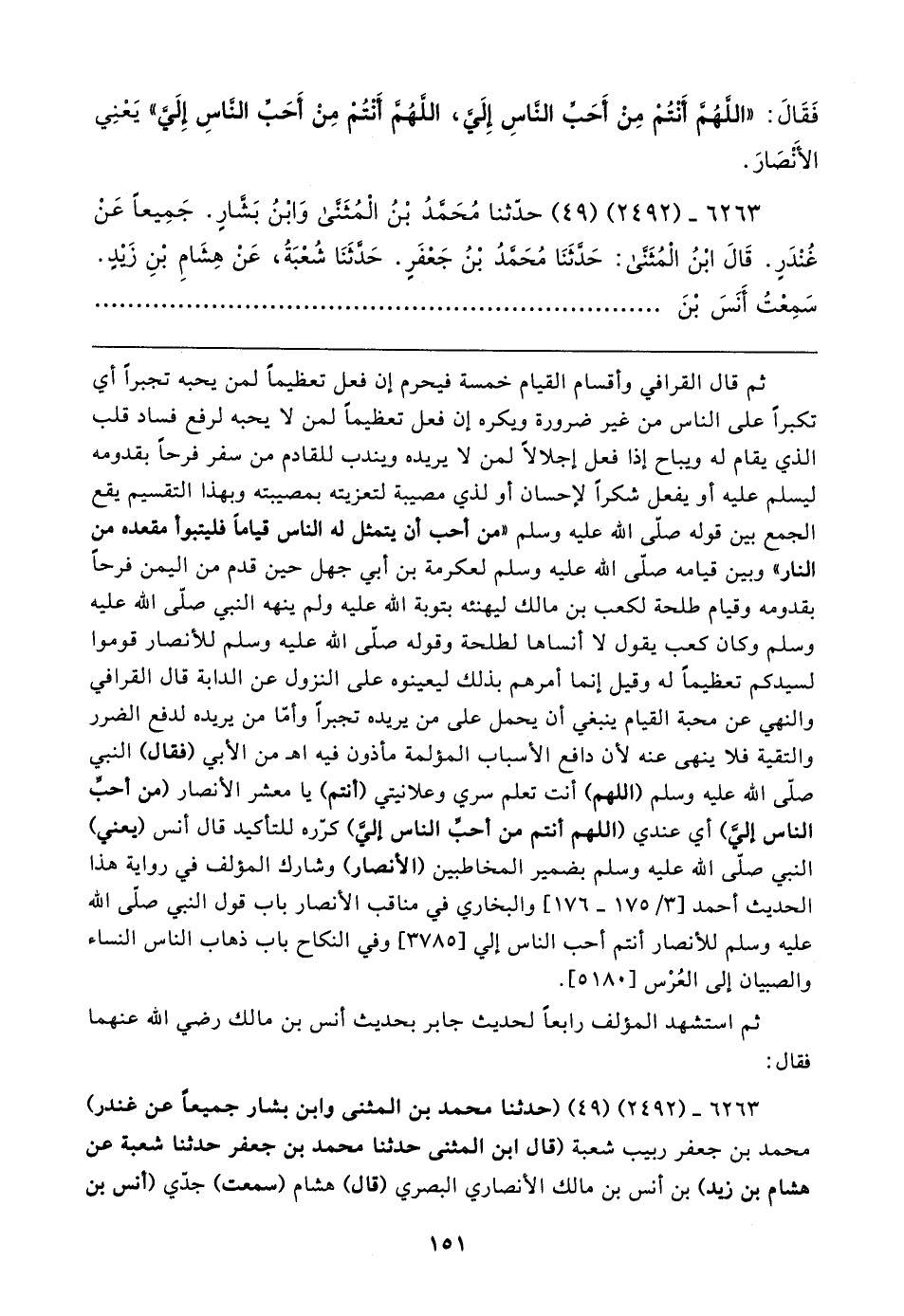 ثم قال القرافي وأقسام القيام خمسة فيحرم إن فعل تعظيمًا لمن يحبه تجبرًا أي تكبرًا على الناس من غير ضرورة ويكره إن فعل تعظيمًا لمن لا يحبه لرفع فساد قلب الذي يقام له ويباح إذا فعل إجلالًا لمن لا يريده ويندب للقادم من سفر فرحًا بقدومه ليسلم عليه أو يفعل شكرًا لإحسان أو لذي مصيبة لتعزيته بمصيبته وبهذا التقسيم يقع الجمع بين قوله صلى الله عليه وسلم "من أحب أن يتمثل له الناس قيامًا فليتبوأ مقعده من النار" وبين قيامه صلى الله عليه وسلم لعكرمة بن أبي جهل حين قدم من اليمن فرحًا بقدومه وقيام طلحة لكعب بن مالك ليهنئه بتوبة الله عليه ولم ينهه النبي صلى الله عليه وسلم وكان كعب يقول لا أنساها لطلحة وقوله صلى الله عليه وسلم للأنصار قوموا لسيدكم تعظيمًا له وقيل إنما أمرهم بذلك ليعينوه على النزول عن الدابة قال القرافي والنهي عن محبة القيام ينبغي أن يحمل على من يريده تجبرًا وأمّا من يريده لدفع الضرر والتقية فلا ينهى عنه لأن دافع الأسباب المؤلمة مأذون فيه اهـ من الأبي (فقال) النبي صلى الله عليه وسلم (اللهم) أنت تعلم سري وعلانيتي (أنتم) يا معشر الأنصار (من أحبِّ الناس إليَّ) أي عندي (اللهم أنتم من أحبِّ الناس إليَّ) كرّره للتأكيد قال أنس (يعني) النبي صلى الله عليه وسلم بضمير المخاطبين (الأنصار) وشارك المؤلف في رواية هذا الحديث أحمد [٣/ ١٧٥ - ١٧٦] والبخاري في مناقب الأنصار باب قول النبي صلى الله عليه وسلم للأنصار أنتم أحب الناس إلي [٣٧٨٥] وفي النكاح باب ذهاب الناس النساء والصبيان إلى العُرْس [٥١٨٠].