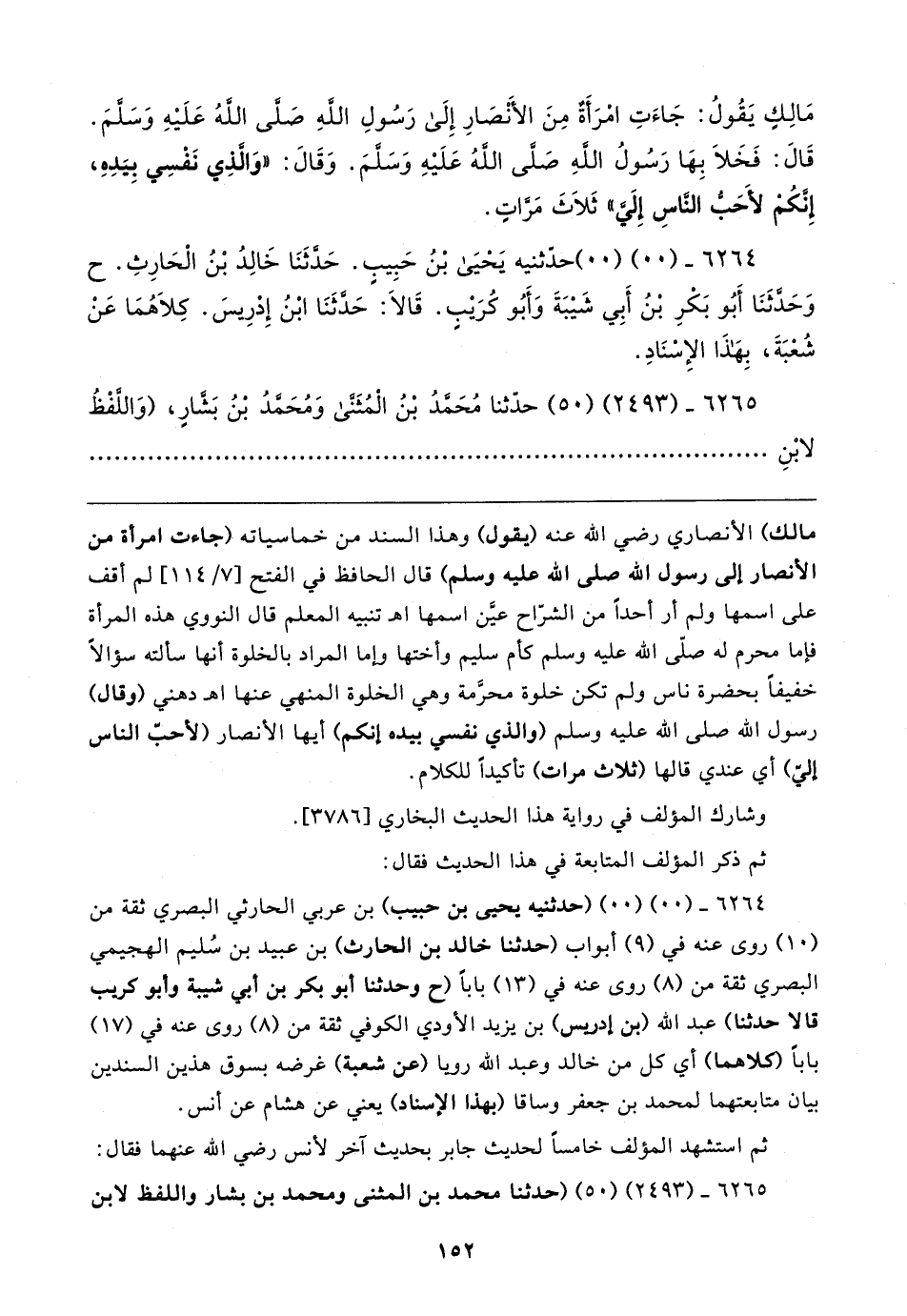 ٦٢٦٤ - (٠٠) (٠٠) (حدثنيه يحيى بن حبيب) بن عربي الحارثي البصري ثقة من (١٠) روى عنه في (٩) أبواب (حدثنا خالد بن الحارث) بن عبيد بن سُليم الهجيمي البصري ثقة من (٨) روى عنه في (١٣) بابا (ح وحدثنا أبو بكر بن أبي شيبة وأبو كريب قالا حدثنا) عبد الله (بن إدريس) بن يزيد الأودي الكوفي ثقة من (٨) روى عنه في (١٧) بابا (كلاهما) أي كل من خالد وعبد الله رويا (عن شعبة) غرضه بسوق هذين السندين بيان متابعتهما لمحمد بن جعفر وساقا (بهذا الإسناد) يعني عن هشام عن أنس.