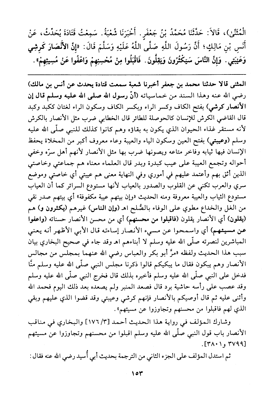 الْمُثَنَّى)، قَالا: حَدَّثَنَا مُحَمَّدُ بْنُ جَعْفَرٍ. أَخْبَرَنَا شُعْبَةُ. سَمِعْتُ قَتَادَةَ يُحَدِّثُ، عَنْ أَنَسِ بْنِ مَالِكٍ؛ أَنَّ رَسُولَ اللهِ صَلَّى اللهُ عَلَيهِ وَسَلَّمَ قَال: "إِن الأَنْصَارَ كَرِشِي وَعَيبَتِي. وَإِنَّ النَّاسَ سَيَكْثُرُونَ ويَقِلُّونَ. فَاقْبَلُوا مِنْ مُحْسِنِهِمْ وَاعْفُوا عَنْ مُسِيئِهِمْ"