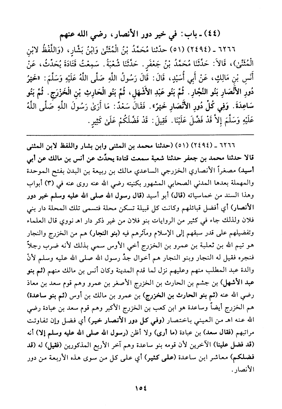 ٦٢٦٦ - (٢٤٩٤) (٥١) حدَّثنا مُحَمَّدُ بْنُ الْمُثَنَّى وَابْنُ بَشَّارٍ، (وَاللَّفْظُ لابْنِ الْمُثَنَّى)، قَالا: حَدَّثَنَا مُحَمَّدُ بْنُ جَعْفَرٍ. حَدَّثَنَا شُعْبَةُ. سَمِعْتُ قَتَادَةَ يُحَدِّثُ، عَنْ أَنَسِ بْنِ مَالِكٍ، عَنْ أَبِي أُسَيدٍ، قَال: قَال رَسُولُ اللهِ صَلَّى اللهُ عَلَيهِ وَسَلَّمَ: "خَيرُ دُورِ الأَنْصَارِ بَنُو النَّجَّارِ. ثُمَّ بَنُو عَبْدِ الأَشْهَلِ، ثُمَّ بَنُو الْحَارِثِ بْنِ الْخَزْرَجِ. ثُمَّ بَنُو سَاعِدَةَ. وَفِي كُلِّ دُورِ الأنْصَارِ خَيرٌ". فَقَال سَعْدٌ: مَا أَرَى رَسُولَ اللهِ صَلَّى اللهُ عَلَيهِ وَسَلَّمَ إلا قَدْ فَضلَ عَلَينَا. فَقِيلَ: قَدْ فَضلَكُمْ عَلَى كَثِيرٍ