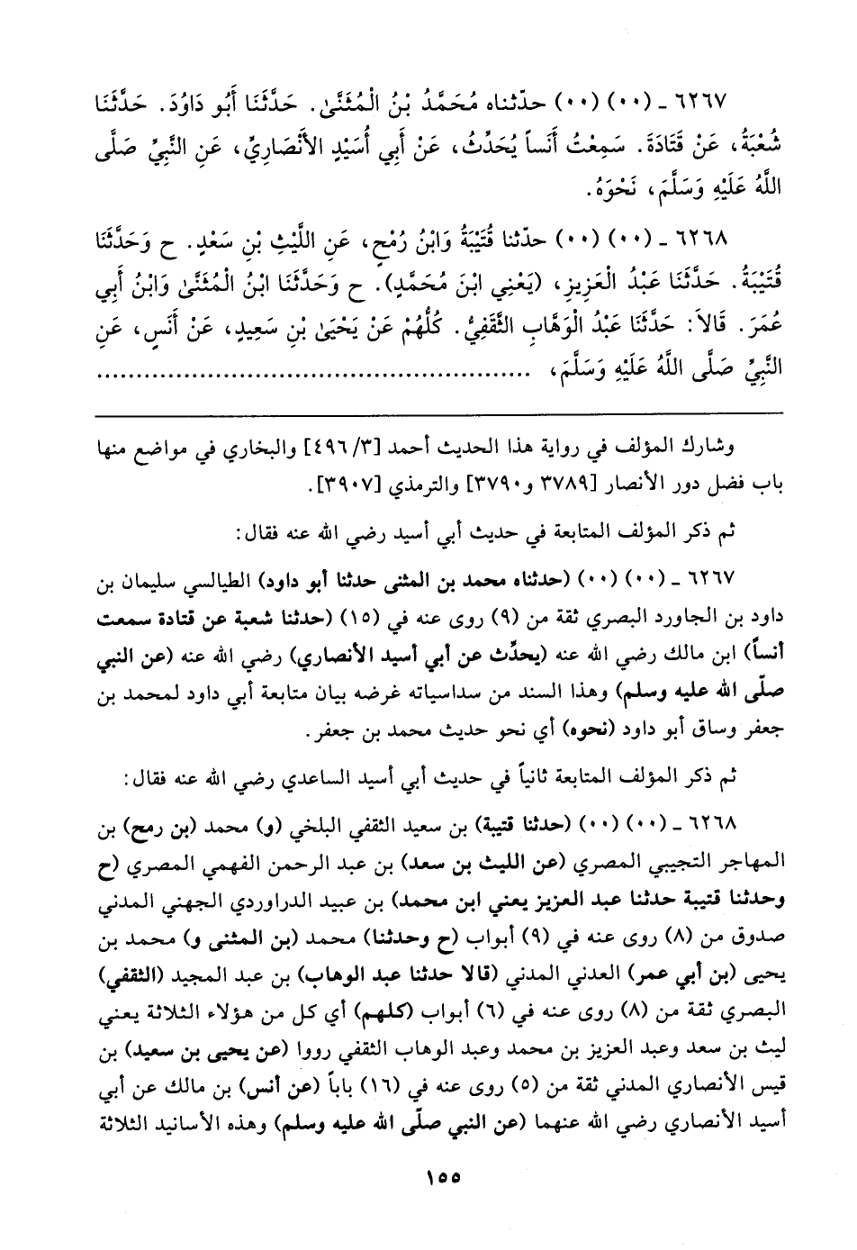 ٦٢٦٧ - (٠٠) (٠٠) (حدثناه محمد بن المثنى حدثنا أبو داود) الطيالسي سليمان بن داود بن الجاورد البصري ثقة من (٩) روى عنه في (١٥) (حدثنا شعبة عن قتادة سمعت أنسًا) ابن مالك رضي الله عنه (يحدِّث عن أبي أسيد الأنصاري) رضي الله عنه (عن النبي صلى الله عليه وسلم) وهذا السند من سداسياته غرضه بيان متابعة أبي داود لمحمد بن جعفر وساق أبو داود (نحوه) أي نحو حديث محمد بن جعفر.