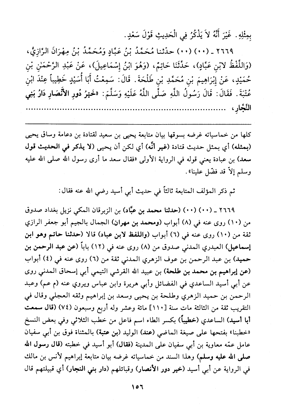 ٢٦٦٩ - (٠٠) (٠٠) (حدثنا محمد بن عبَّاد) بن الزبرقان المكي نزيل بغداد صدوق من (١٠) روى عنه في (٨) أبواب (ومحمد بن مهران) الجمال بالجيم أبو جعفر الرازي ثقة من (١٠) روى عنه في (٦) أبواب (واللفظ لابن عباد) قالا (حدثنا حاتم وهو ابن إسماعيل) العبدري المدني صدوق من (٨) روى عنه في (١٢) بابا (عن عبد الرحمن بن حميد) بن عبد الرحمن بن عوف الزهري المدني ثقة من (٦) روى عنه في (٤) أبواب (عن إبراهيم بن محمد بن طلحة) بن عبيد الله القرشي التيمي أبي إسحاق المدني روى عن أبي أسيد الساعدي في الفضائل وأبي هريرة وابن عباس ويروي عنه (م عم) وعبد الرحمن بن حميد الزهري وطلحة بن يحيى وسعد بن إبراهيم وثقه العجلي وقال في التقريب ثقة من الثالثة مات سنة [١١٠] مائة وعشر وله أربع وسبعون (٧٤) (قال سمعت أبا أسيد) الساعدي (خطيبًا) بكسر الطاء اسم فاعل من خطب الثلاثي وفي بعض النسخ "خطبنا" بفتحها على صيغة الماضي (عند) الوليد (بن عتبة) بالمثناة فوق بن أبي سفيان عامل عمّه معاوية بن أبي سفيان على المدينة (فقال) أبو أسيد في خطبته (قال رسول الله صلى الله عليه وسم) وهذا السند من خماسياته غرضه بيان متابعة إبراهيم لأنس بن مالك في الرواية عن أبي أسيد (خير دور الأنصار) وقبائلهم (دار بني النجار) أي قبيلتهم قال