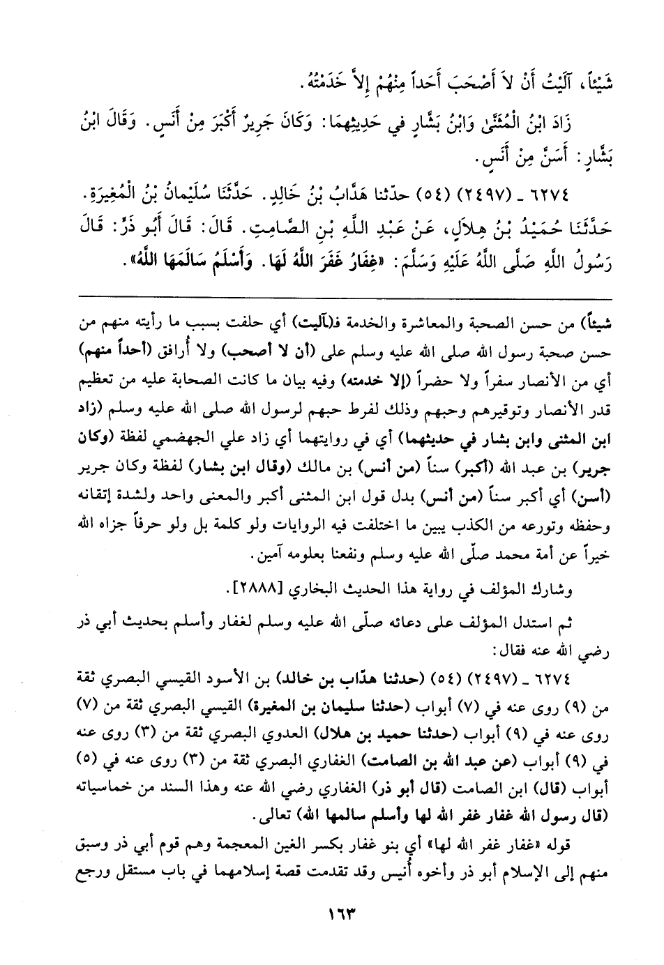 ٦٢٧٤ - (٢٤٩٧) (٥٤) حدَّثنا هَدَّابُ بْنُ خَالِدٍ. حَدَّثَنَا سُلَيمانُ بْنُ الْمُغِيرَةِ. حَدَّثَنَا حُمَيدُ بْنُ هِلالٍ، عَنْ عَبْدِ اللهِ بْنِ الصَّامِتِ. قَال: قَال أَبُو ذَرٍّ: قَال رَسُولُ اللهِ صَلَّى اللهُ عَلَيهِ وَسَلَّمَ: "غِفَارُ غَفَرَ اللهُ لَهَا. وَأَسْلَمُ سَالمَهَا اللهُ"