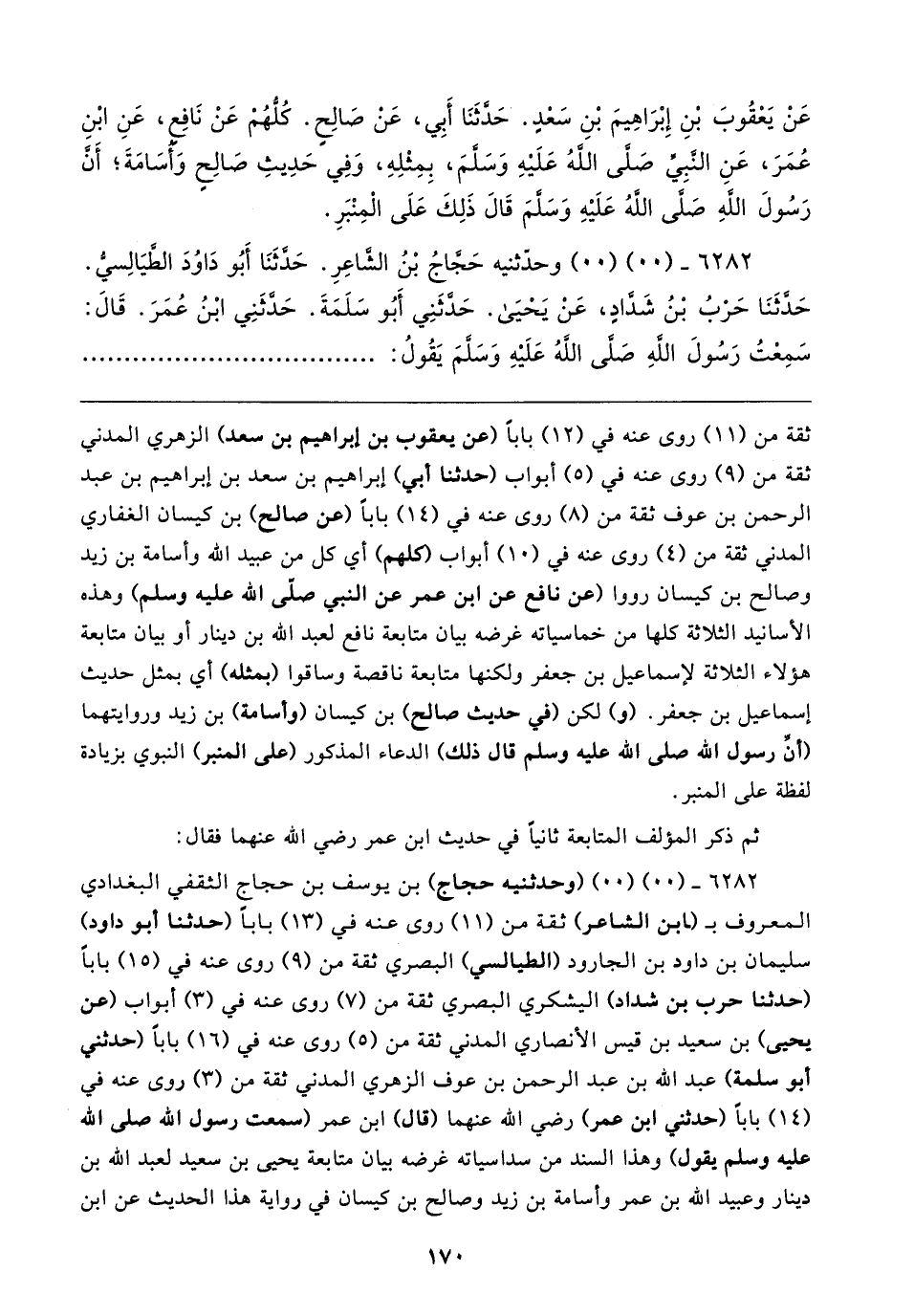 عَنْ يَعْقُوبَ بْنِ إِبْرَاهِيمَ بْنِ سَعْدٍ. حَدَّثَنَا أَبِي، عَنْ صَالِحٍ. كُلُّهُمْ عَنْ نَافِعٍ، عَنِ ابْنِ عُمَرَ، عَنِ النَّبِيِّ صَلَّى اللهُ عَلَيهِ وَسَلَّمَ، بِمِثْلِهِ، وَفِي حَدِيثِ صَالِحٍ وَأُسَامَةَ؛ أَنَّ رَسُولَ اللهِ صَلَّى اللهُ عَلَيهِ وَسَلَّمَ قَال ذَلِكَ عَلَى الْمِنْبَرِ.