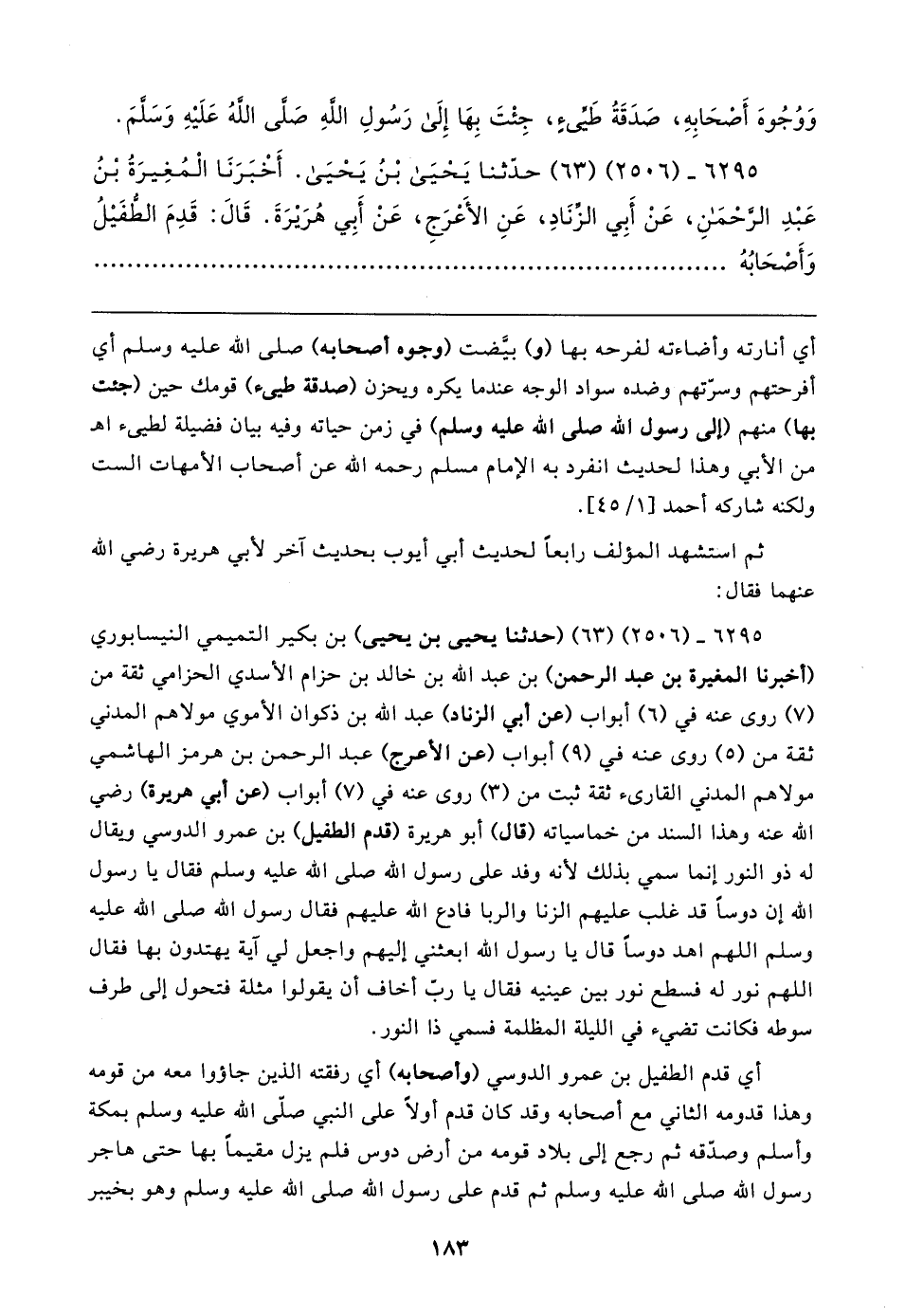 ٦٢٩٥ - (٢٥٠٦) (٦٣) (حدثنا يحيى بن يحيى) بن بكير التميمي النيسابوري (أخبرنا المغيرة بن عبد الرحمن) بن عبد الله بن خالد بن حزام الأسدي الحزامي ثقة من (٧) روى عنه في (٦) أبواب (عن أبي الزناد) عبد الله بن ذكوان الأموي مولاهم المدني ثقة من (٥) روى عنه في (٩) أبواب (عن الأعرج) عبد الرحمن بن هرمز الهاشمي مولاهم المدني القارئ ثقة ثبت من (٣) روى عنه في (٧) أبواب (عن أبي هريرة) رضي الله عنه وهذا السند من خماسياته (قال) أبو هريرة (قدم الطفيل) بن عمرو الدوسي ويقال له ذو النور إنما سمي بذلك لأنه وفد على رسول الله صلى الله عليه وسلم فقال يا رسول الله إن دوسًا قد غلب عليهم الزنا والربا فادع الله عليهم فقال رسول الله صلى الله عليه وسلم اللهم اهد دوسًا قال يا رسول الله ابعثني إليهم واجعل لي آية يهتدون بها فقال اللهم نور له فسطع نور بين عينيه فقال يا ربّ أخاف أن يقولوا مثلة فتحول إلى طرف سوطه فكانت تضيء في الليلة المظلمة فسمي ذا النور.