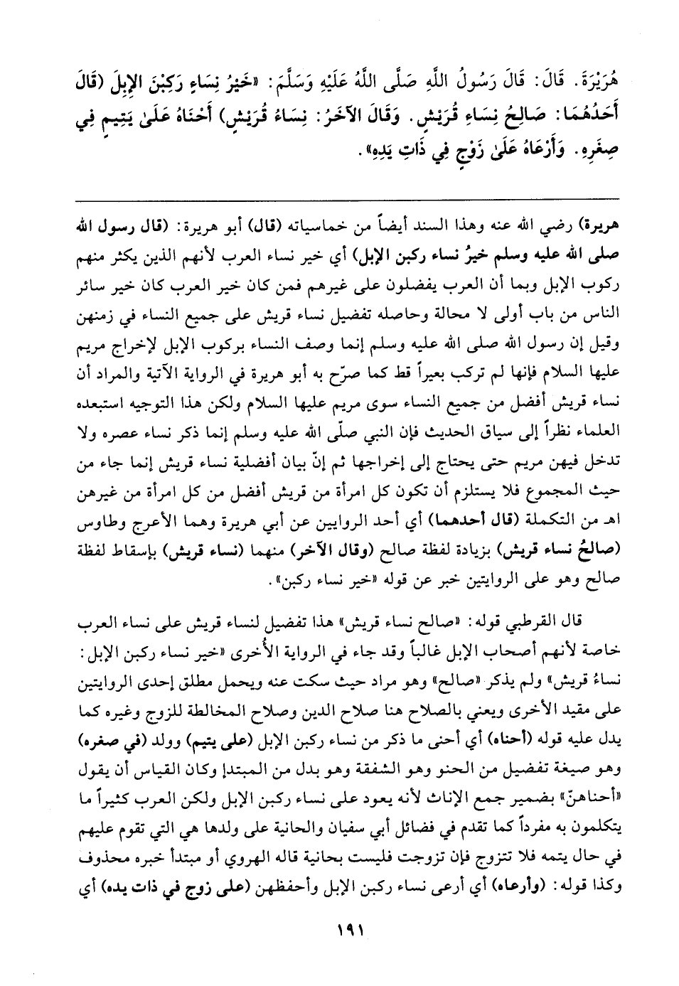 هُرَيرَةَ. قَال: قَال رَسُولُ الله صلى الله عَلَيهِ وَسَلمَ: "خَيرُ نِسَاءٍ رَكِبْنَ الإبِلَ (قَال أَحَدُهُمَا: صَالِحُ نِسَاءِ قُرَيش. وَقَال الآخَرُ: نِسَاءُ قُرَيش) أَحْنَاهُ عَلَى يَتِيمٍ فِي صِغَرِهِ. وَأرعَاهُ عَلَى زَوْجٍ فِي ذَاتِ يَدِهِ"