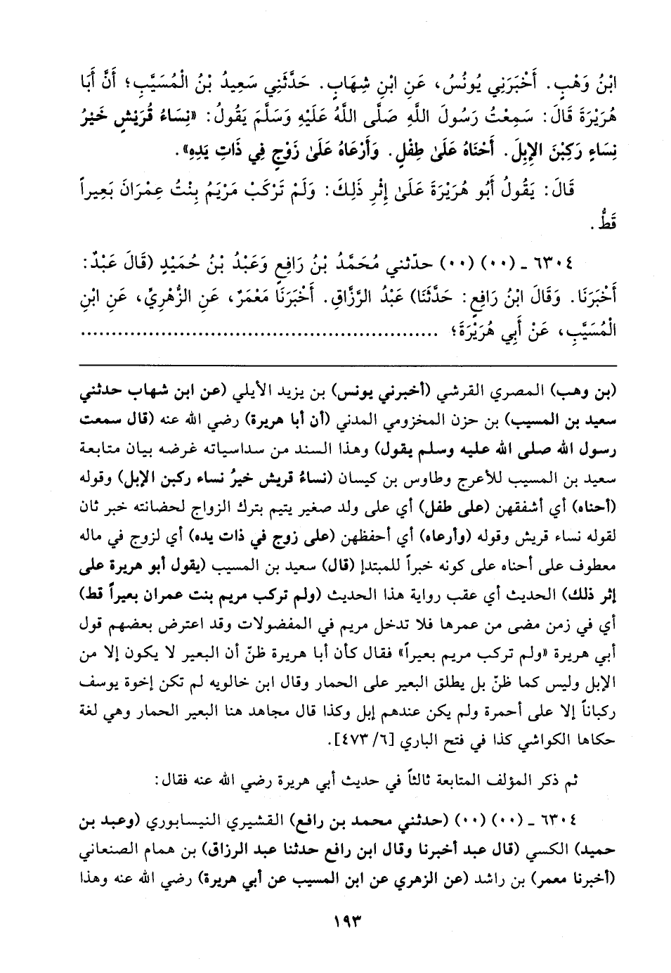 ابْنُ وَهْبٍ. أَخْبَرَنِي يُونُسُ، عَنِ ابْنِ شِهابٍ. حَدَثَنِي سَعِيدُ بْنُ الْمُسَيبِ؛ أَن أَبَا هُرَيرَةَ قَال: سَمِعْتُ رَسُولَ الله صَلى الله عَلَيهِ وَسَلمَ يَقُولُ: "نِسَاءُ قُرَيشٍ خَيرُ نِسَاءٍ رَكِبْنَ الإِبِلَ. أَحْنَاهُ عَلَى طِفْلٍ. وَأَرْعَاهُ عَلَى زَوْجٍ فِي ذَاتِ يَدِهِ".